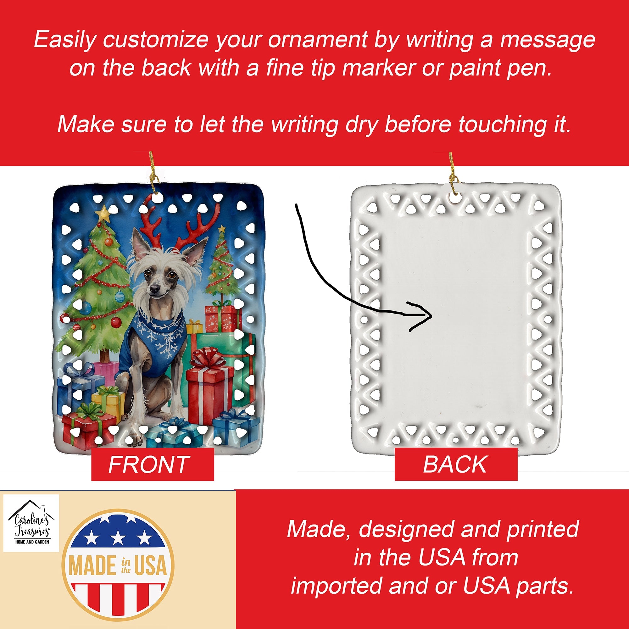Porcelain Ornament featuring breed specific Chinese Crested artwork. Celebrate Christmas with this Christmas Ornament. Add a unique, personal touch to your holiday decor with our Rectangular Lattice Porcelain Ornament. Perfect for creating cherished memories, this high-quality ornament shines under festive lights, reflecting warmth and joy throughout your Christmas tree. Crafted with a glossy finish, it showcases vibrant, full-color artwork contributed by our talented artists, ensuring your tree is adorned with a burst of color and holiday spirit. What sets this Porcelain Ornament apart is its customizable white back. Use a paint pen or permanent marker to write a heartfelt message, commemorate a special year, or mark an unforgettable date, turning this ornament into a keepsake that will be treasured for years to come. For best results, allow any personalization to dry thoroughly before handling. Each ornament comes complete with a delicate gold cord, making it easy to hang and display. Proudly made in the USA, this ornament measures 3.375 x 2.625 inches and is a thoughtful gift for pet sitters, teachers, family members, or anyone who would appreciate a little extra holiday magic. Bring style, charm, and a touch of personal meaning to your Christmas tree with this beautifully designed ornament..