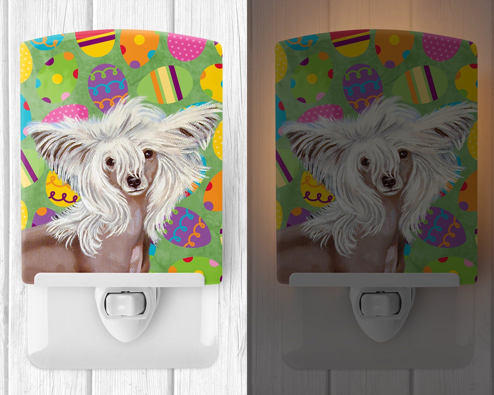 Decorate your space with our Easter Chinese Crested artwork on a Night Light. Introduce a splash of artistic flair and subtle illumination to your space with the Decorative Ceramic Night Light from Caroline's Treasures. Perfect for any room, this night light seamlessly blends functionality with an aesthetic appeal, offering a stylish solution to brighten up dark corners of your home or office. Boasting a six-inch high by four-inch wide ceramic tile at the front, it showcases vivid, full-color artwork from distinguished artists, transforming a simple utility into a vibrant art piece. The artwork is securely encased in a robust metal holder, ensuring durability and longevity. Two screws are provided to firmly affix the tile into the holder. The holder extends three inches deep, housing an included bulb that emits a soft, welcoming glow. This product meets all safety standards, as evidenced by its UL approval. Proudly made in the United States from imported components, this Decorative Ceramic Night Light is not just a functional device; it's a statement piece that enhances the ambiance of your surroundings.