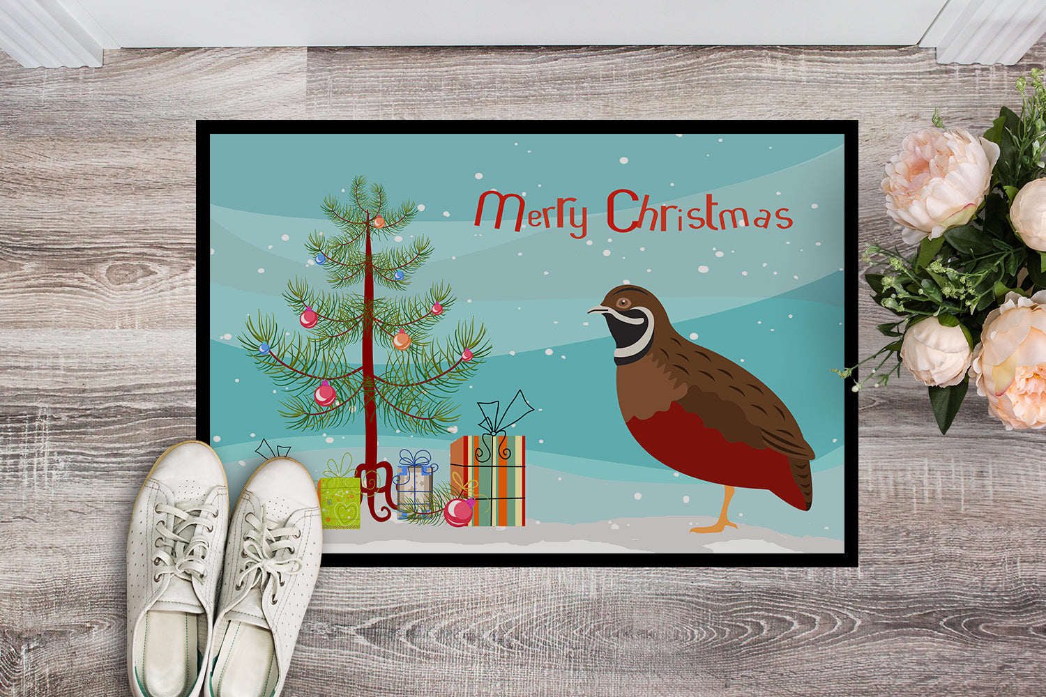 Decorate your space with our Christmas Chinese Painted or King Quail artwork on a Doormat. Welcome your guests in style with our Artwork Door Mat, designed to withstand almost any weather condition. This mat, measuring approximately 24 by 36 inches, is held together by durable black binding tape. Its top layer, composed of polyester felt, is dyed with the eye-catching image you see on the mat. A few layers below provide the mat with stability, while its rubber bottom is stamped to help prevent slipping and ensures safety. Our mat works wonderfully as both an indoor or outdoor door mat. For cleaning, simply hose it off with water or use a power washer - no need for any cleaner that produces suds. Avoid scrubbing with a brush, instead, opt for the vacuum on floor setting. Designed manufactured and printed in the USA, this mat is a perfect addition to your porch, outdoor kitchen, entryway, or any indoor space. Its unique design makes it a charming decorative rug that greets your guests and adds a stylish touch to your home decor.