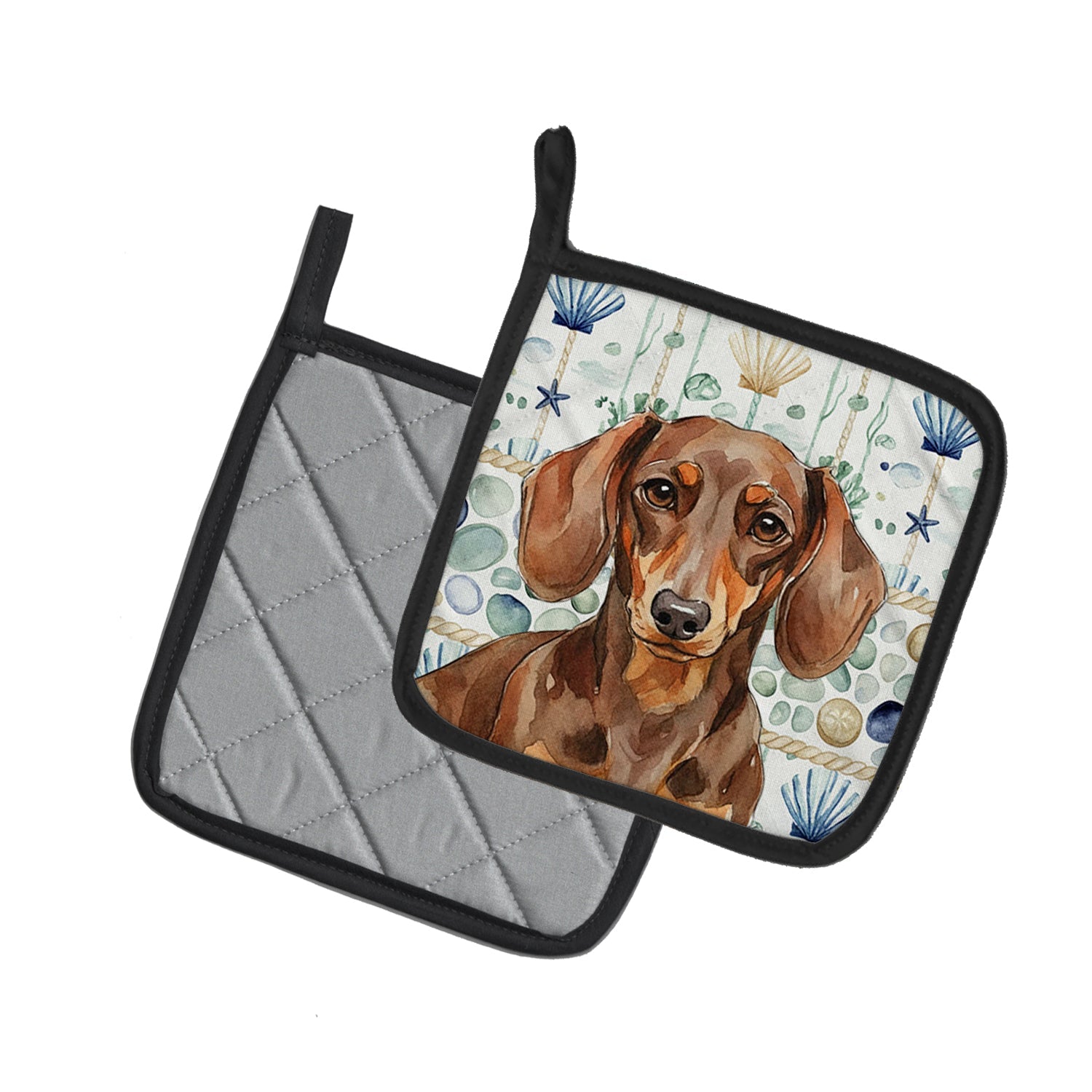 Pair of Pot Holders featuring breed specific Dachshund artwork. Add warmth, personality, and function to your kitchen with our Coastal Sea Glass Pot Holder Pair. Each set includes two quilted hot pads, featuring original full-color watercolor artwork on a soft polyester front accented by black trim. Crafted with multiple layers for performance: Top Layer: Vibrant artwork permanently dyed into polyester fabric. Middle Layer: US-manufactured insulated material with breathable polyester fibers and a reflective metalized film that reflects heat back to its source. Bottom Layer: A silver heat-resistant backing for extra protection. Each pot holder measures 7.5" x 7.5", includes a hanging tab, and is quilted for durability. Use them to protect your hands, countertops, and tabletops — or as decorative trivets for Thanksgiving, Christmas, or everyday meals.