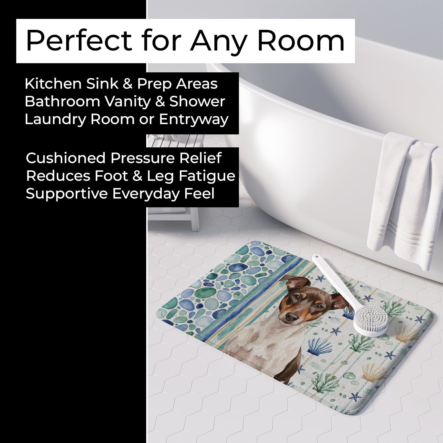 Shown here is the Chocolate and White Rat Terrier Coastal Sea Glass Memory Foam Kitchen Mat from Caroline's Treasures featuring artwork of a Rat Terrier in a Everyday design. The detailed illustration and vibrant colors make it a standout accent that celebrates both seasonal style and love for the subject. This image features a calming coastal watercolor pattern with soft seashells, seaweed, starfish, and pebble-inspired accents arranged in a repeating design. The soothing palette of blues, greens, and sandy neutrals creates a relaxed, beach-inspired look that adds a fresh and tranquil feel to any space. Everyday décor celebrates personal style and the small moments that make a house feel like home. Thoughtful designs add warmth and personality that can be enjoyed year-round. Transform your floor into a work of art with Caroline's Treasures' Memory Foam Mat. This mat offers not only a stunning visual appeal but also a luxurious, plush feel that's incredibly comfortable to the touch. It's a versatile, machine-washable mat designed for both bath and kitchen use, ensuring you experience the best in comfort and convenience. Care Instructions: Maintaining this memory foam mat is a breeze. Simply follow the care instructions on the product tag. It's recommended to wash in cold water and dry on a low-temperature setting in the dryer. This ensures the mat retains its quality and longevity, allowing you to enjoy its beauty and comfort for a long time. Caroline's Treasures' Memory Foam Mat Machine Washable is the perfect blend of artistry, comfort, and practicality, making it a standout addition to any space. Upgrade your home decor with this versatile and stylish mat today. Rat Terriers are energetic dogs known for their intelligence and adaptability. This versatile breed is admired for its loyalty, alertness, and strong companionship. Makes a heartfelt gift for: Rat Terrier owners, Dogs lovers, Everyday gifts, pet parents, friends who adore their Rat Terrier, or anyone celebrating Dogs.