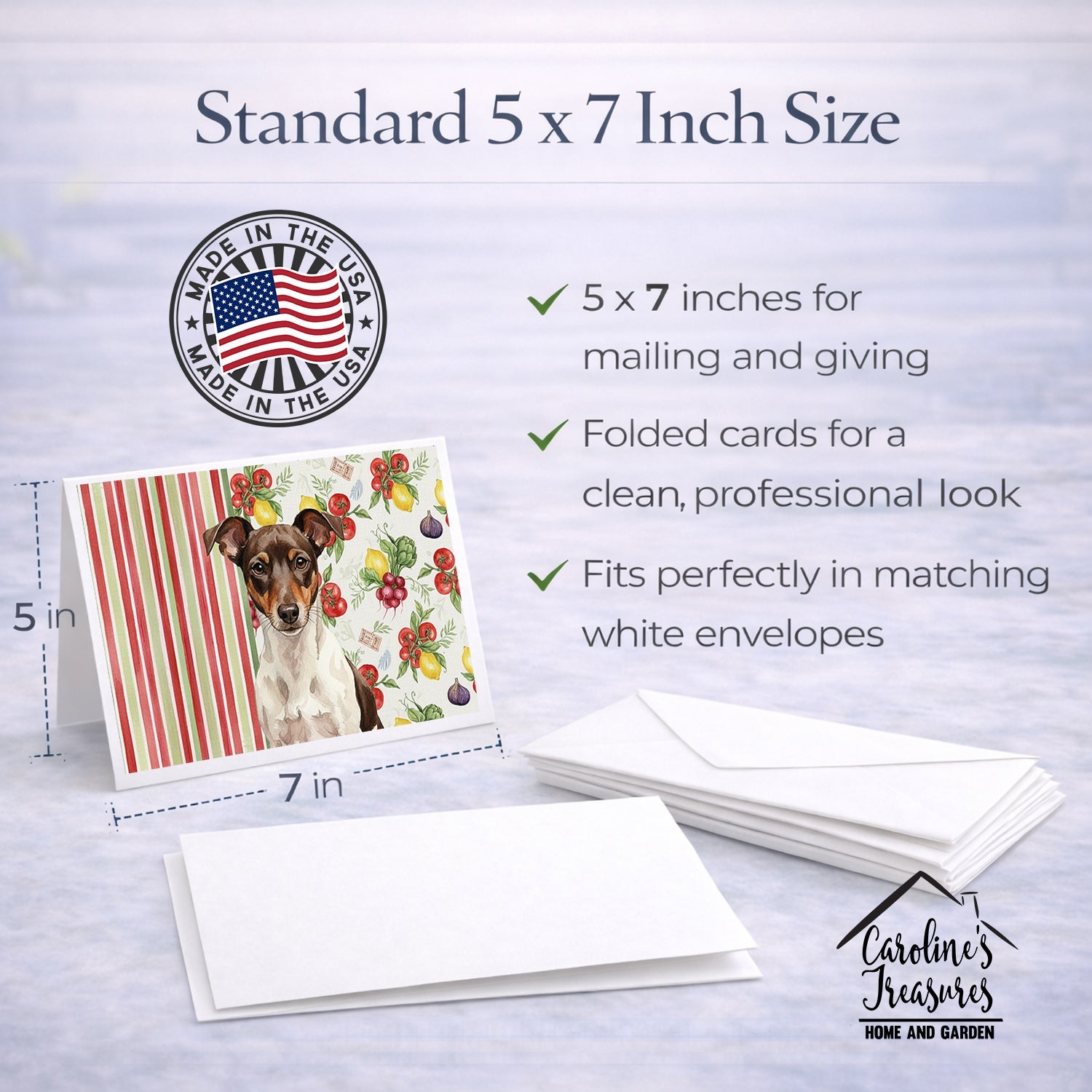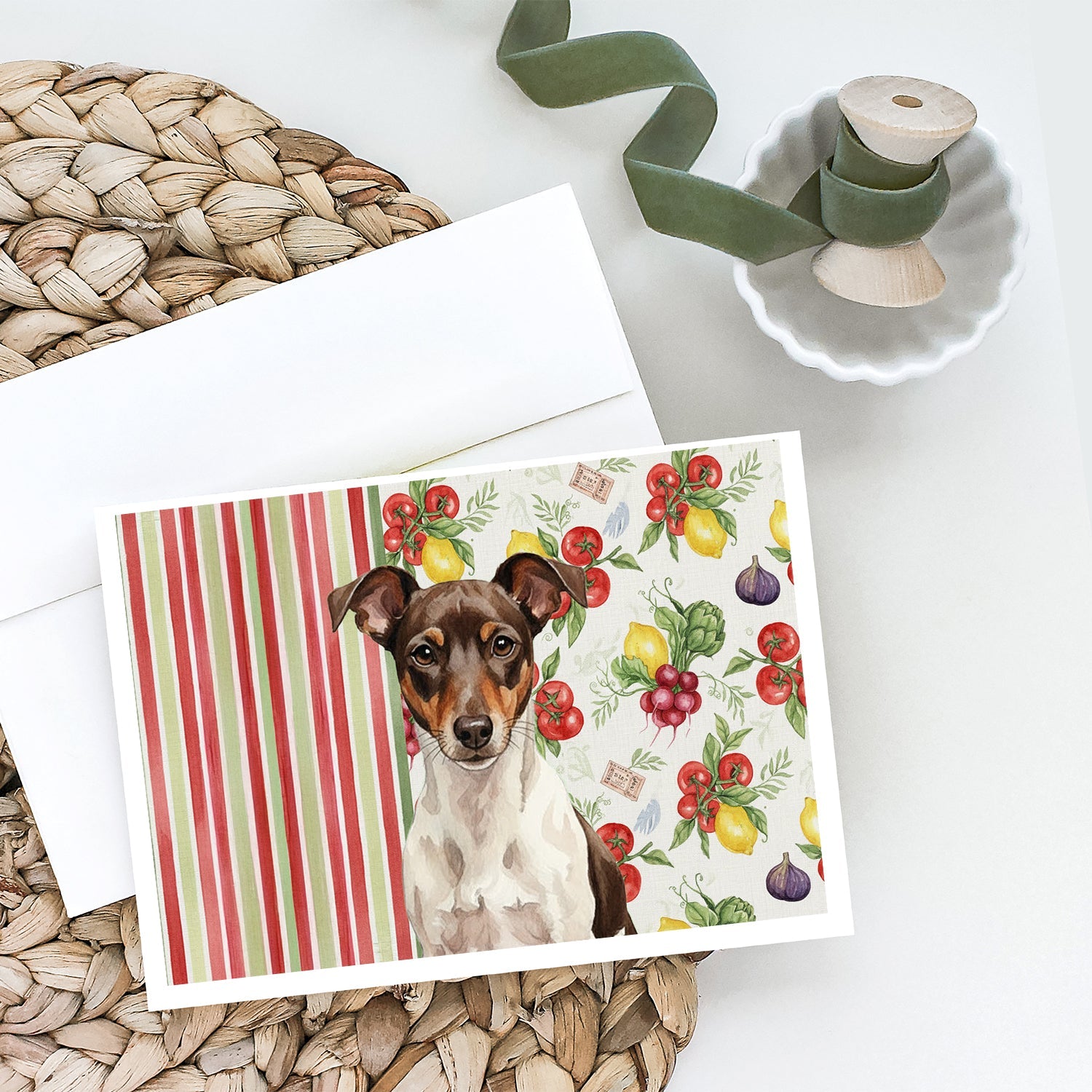 Shown here is the Chocolate and White Rat Terrier Vegetables Greeting Cards Pack of 8 from Caroline's Treasures featuring artwork of a Rat Terrier in a Everyday design. The detailed illustration and vibrant colors make it a standout accent that celebrates both seasonal style and love for the subject. This image features a vibrant watercolor vegetable pattern with tomatoes, lemons, artichokes, figs, radishes, and leafy greens arranged in a repeating design, paired with classic red and green stripes. The bright, garden-fresh palette creates a cheerful, farmhouse-inspired look that feels lively, welcoming, and perfect for kitchen décor. Everyday décor celebrates personal style and the small moments that make a house feel like home. Thoughtful designs add warmth and personality that can be enjoyed year-round. Celebrate special moments with Caroline's Treasures Printed Greeting Card Pack. This pack includes eight beautifully folded 5x7 cards, accompanied by eight matching white envelopes. With blank interiors, these cards provide ample space for your personalized messages and heartfelt holiday greetings. Each card features captivating full-color artwork, meticulously printed in our facility on high-quality 80 lb cover stock or 216 GSM. The super smooth finish of the white cards enhances the visual impact of the artwork, creating a truly stunning presentation. Designed by our talented in-house artists or licensed artists, the artwork on these cards showcases their creativity and attention to detail. From vibrant illustrations to captivating designs, each card tells its own unique story. Whether it's for birthdays, anniversaries, holidays, or any special occasion, Caroline's Treasures Greeting Card Pack is the perfect way to convey your heartfelt sentiments. Share joy, love, and warm wishes with these exquisite cards and make every moment unforgettable. Perfect for: Writing personal messages, everyday correspondence, and thoughtful notes, Dogs-themed stationery collections, or year-round use for Rat Terrier lovers. Rat Terriers are energetic dogs known for their intelligence and adaptability. This versatile breed is admired for its loyalty, alertness, and strong companionship. Makes a heartfelt gift for: Rat Terrier owners, Dogs lovers, Everyday gifts, pet parents, friends who adore their Rat Terrier, or anyone celebrating Dogs.