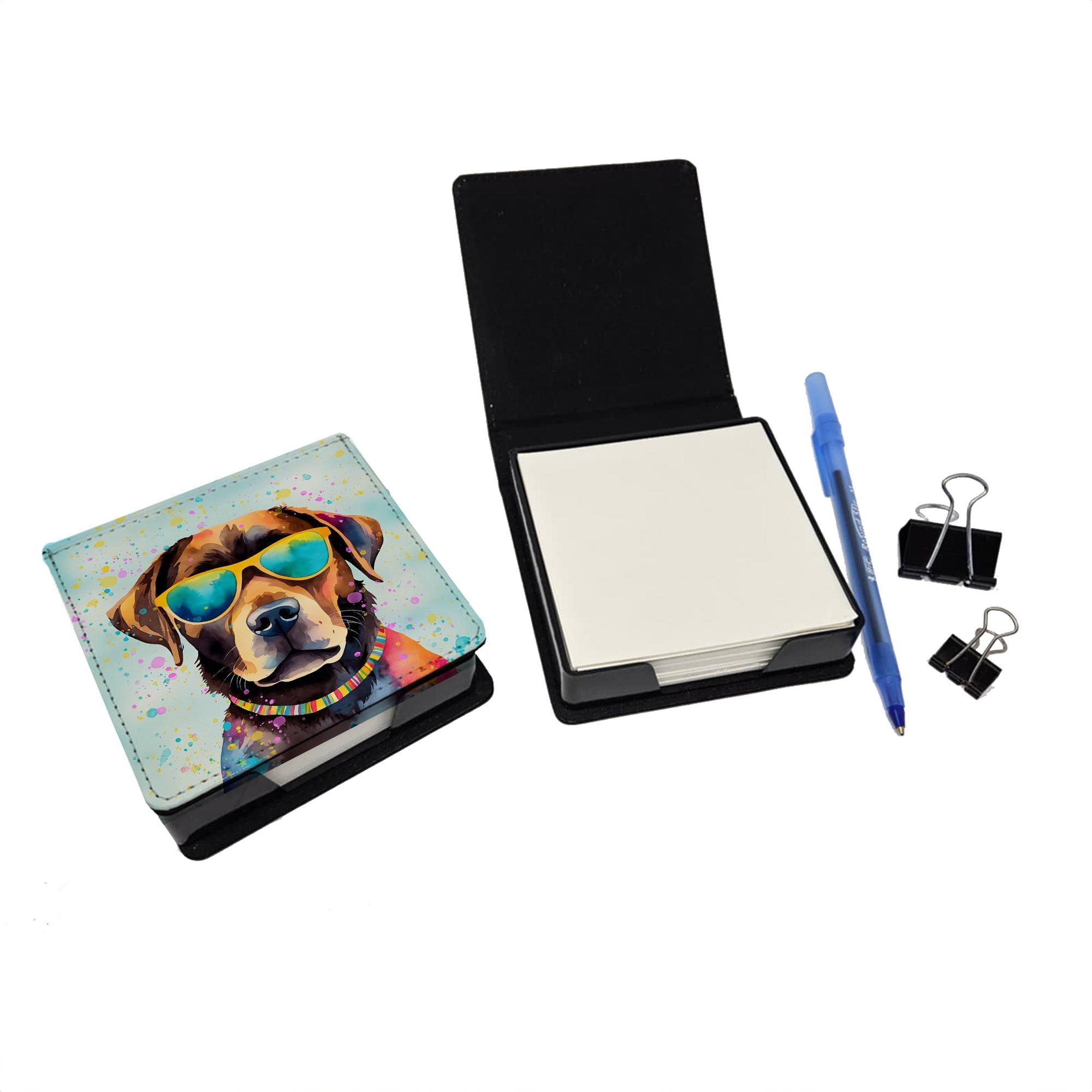 PU Leather Note Paper Holder featuring breed specific Chocolate Labrador artwork. Elevate your workspace with this PU Leather Note Paper Holder, crafted to resemble luxurious leather without the use of animal products. Made from durable synthetic PU leather, it offers both a premium look and eco-friendly appeal. This note holder, compactly sized at 4.25 x 4.25 x 1.25 inches, includes about 160 sheets of 3.75 x 3.75-inch note paper—ideal for quick notes and reminders. An exclusive artist-designed cover makes each holder uniquely vibrant, adding a splash of color and personality to any desk or office. The discrete design keeps note paper hidden, maintaining a neat and organized workspace. Perfect as a gift or for personal use, this stylish holder is refillable with standard paper, ensuring long-lasting utility. A must-have for anyone seeking a sophisticated, artful touch to their workspace while supporting animal-friendly products. Add style, organization, and creativity to your everyday routine with this elegant note paper holder.