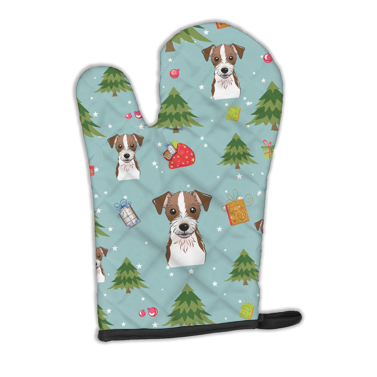 Decorate your space with our Christmas Jack Russell Terrier artwork on a Oven Mitt. Presenting our Large Right Hand Thick Heat Resistant Oven Mitt, an indispensable tool for any culinary enthusiast. This mitt boasts layers of quilted protection on both sides, providing outstanding resistance against extreme heat. Embellished with beautifully printed artwork, it adds an extra dash of charm to your kitchen decor. At about 12 inches long and 8 1/2 inches wide, this oven mitt offers a generous fit, accommodating a diverse range of hand sizes. Its design is enhanced by a sleek Black bias tape trim, finished with a convenient hoop for easy hanging. Fresh out of the packaging, the quilting process may give the mitt a stiff feel, but rest assured, it will soften with use and washing. Our mitt is crafted with a unique center fabric, Insul-Bright, a composite material made from polyester fibers, needle-punched through a nonwoven substrate and a reflective metallized film. This smart material resists both conduction and radiant energy, reflecting heat back to its source, all while remaining breathable. Our oven mitt is machine washable and safe for tumble drying. It's a perfect gift for your favorite Chef, BBQ enthusiast, or just a little treat for yourself! Experience safety, style, and convenience rolled into one with this exceptional oven mitt.