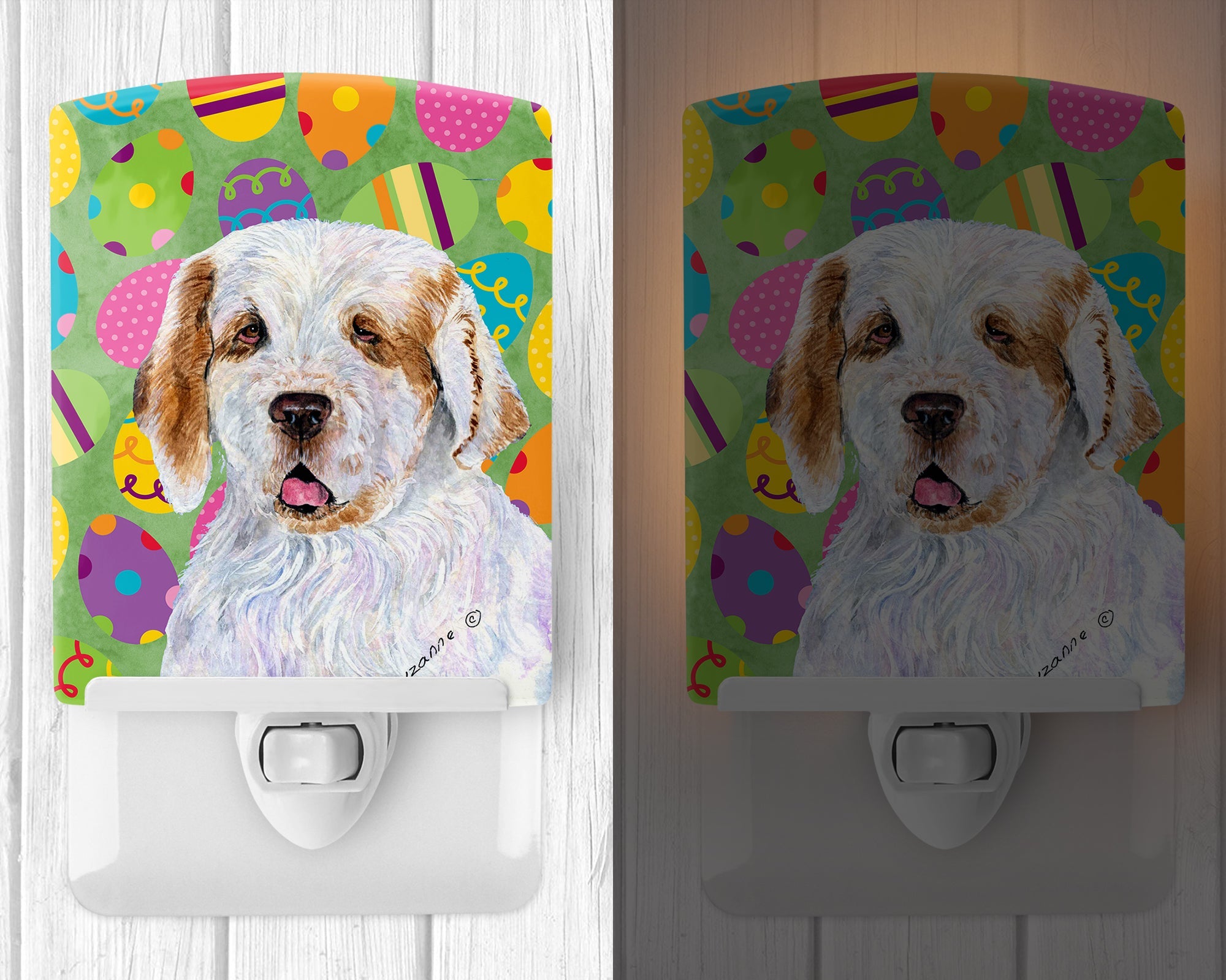 Decorate your space with our Easter Clumber Spaniel artwork on a Night Light. Introduce a splash of artistic flair and subtle illumination to your space with the Decorative Ceramic Night Light from Caroline's Treasures. Perfect for any room, this night light seamlessly blends functionality with an aesthetic appeal, offering a stylish solution to brighten up dark corners of your home or office. Boasting a six-inch high by four-inch wide ceramic tile at the front, it showcases vivid, full-color artwork from distinguished artists, transforming a simple utility into a vibrant art piece. The artwork is securely encased in a robust metal holder, ensuring durability and longevity. Two screws are provided to firmly affix the tile into the holder. The holder extends three inches deep, housing an included bulb that emits a soft, welcoming glow. This product meets all safety standards, as evidenced by its UL approval. Proudly made in the United States from imported components, this Decorative Ceramic Night Light is not just a functional device; it's a statement piece that enhances the ambiance of your surroundings.