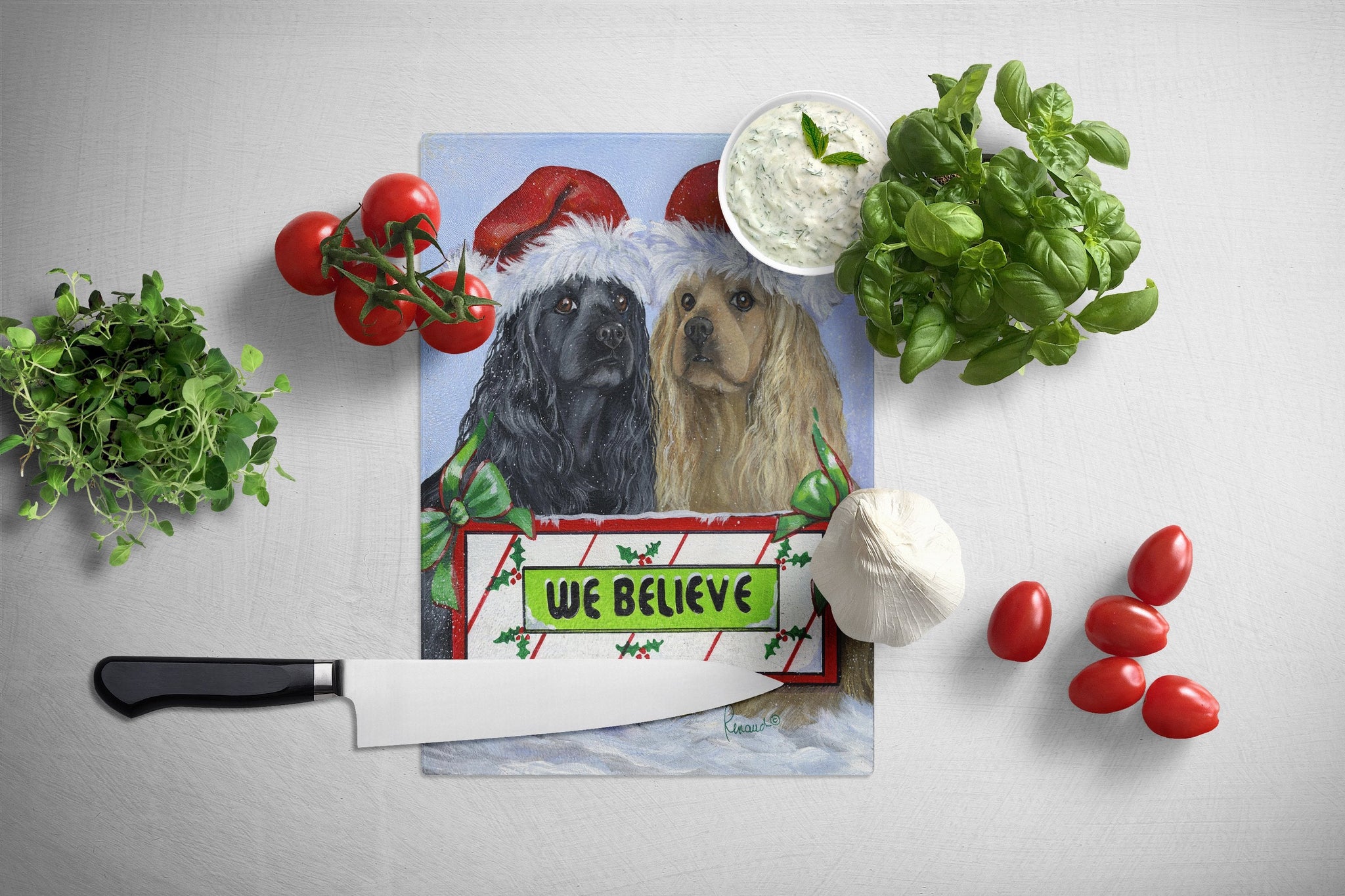 Decorate your space with our Christmas Cocker Spaniel artwork on a Cutting Board. Introduce your kitchen to the vibrant, large Decorative Glass Cutting Board from Caroline's Treasures. Crafted from resilient tempered glass, this board is not only a utilitarian necessity but also a colorful art piece. With its generous dimensions of 15 inches in height and 12 inches in length, it offers ample space for all your cutting needs. Every piece showcases captivating artwork from distinguished artists, bringing an aesthetic edge to your kitchen. Beyond its attractive design, this cutting board ensures your countertop stays pristine and unscathed, owing to its heat-resistant properties. Engineered with user convenience in mind, it features non-skid feet for stability, and rounded corners for additional safety. Its robust construction renders it virtually unbreakable, guaranteeing longevity. The board comes with protective feet bumpers, maintaining its position during use. This product is recommended to be hand washed only. Proudly printed and assembled in the United States, this cutting board exemplifies superior craftsmanship. With Caroline's Treasures' Decorative Glass Cutting Board, you're investing in a blend of functionality and artistic flair.