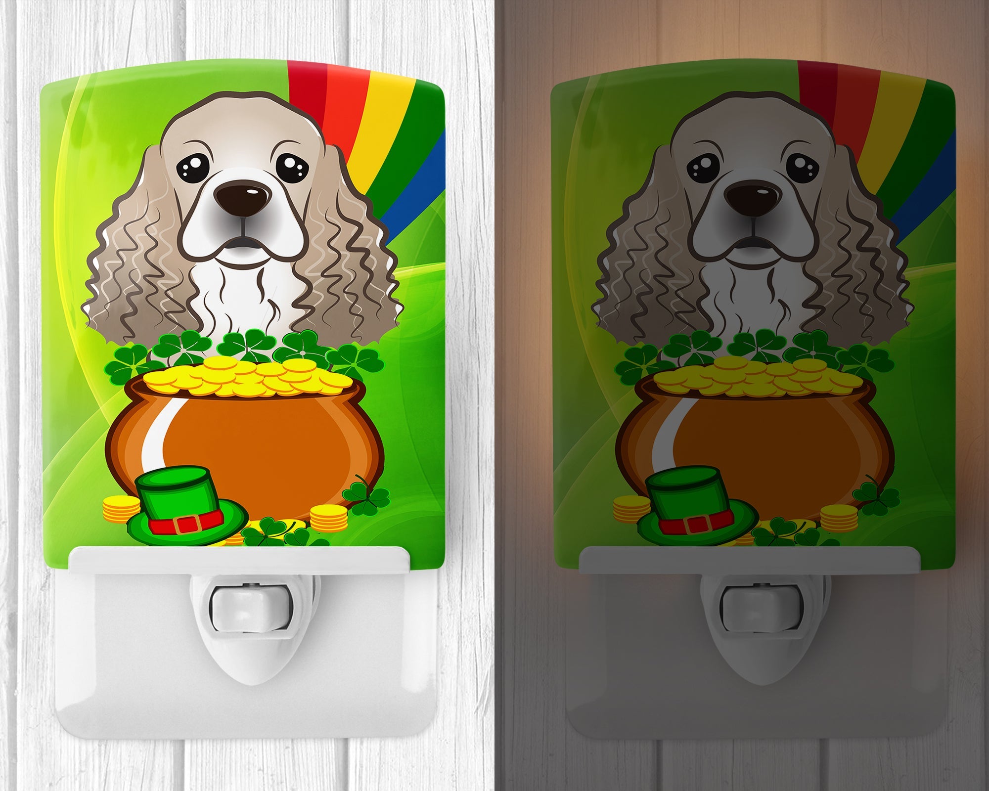 Decorate your space with our St Patrick's Day Cocker Spaniel artwork on a Night Light. Introduce a splash of artistic flair and subtle illumination to your space with the Decorative Ceramic Night Light from Caroline's Treasures. Perfect for any room, this night light seamlessly blends functionality with an aesthetic appeal, offering a stylish solution to brighten up dark corners of your home or office. Boasting a six-inch high by four-inch wide ceramic tile at the front, it showcases vivid, full-color artwork from distinguished artists, transforming a simple utility into a vibrant art piece. The artwork is securely encased in a robust metal holder, ensuring durability and longevity. Two screws are provided to firmly affix the tile into the holder. The holder extends three inches deep, housing an included bulb that emits a soft, welcoming glow. This product meets all safety standards, as evidenced by its UL approval. Proudly made in the United States from imported components, this Decorative Ceramic Night Light is not just a functional device; it's a statement piece that enhances the ambiance of your surroundings.