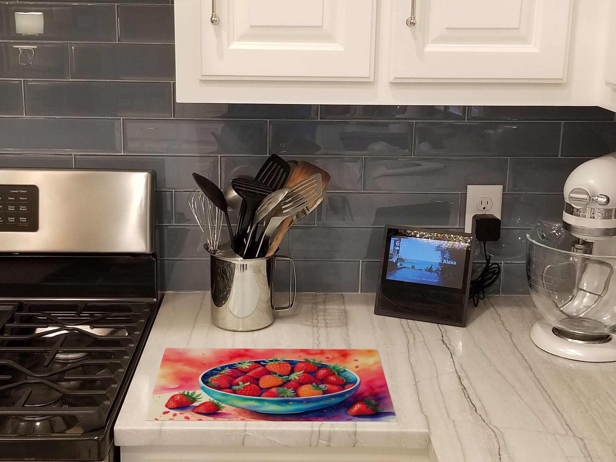 Decorate your space with our Strawberries artwork on a Cutting Board. Introduce your kitchen to the vibrant, large Decorative Glass Cutting Board from Caroline's Treasures. Crafted from resilient tempered glass, this board is not only a utilitarian necessity but also a colorful art piece. With its generous dimensions of 15 inches in height and 12 inches in length, it offers ample space for all your cutting needs. Every piece showcases captivating artwork from distinguished artists, bringing an aesthetic edge to your kitchen. Beyond its attractive design, this cutting board ensures your countertop stays pristine and unscathed, owing to its heat-resistant properties. Engineered with user convenience in mind, it features non-skid feet for stability, and rounded corners for additional safety. Its robust construction renders it virtually unbreakable, guaranteeing longevity. The board comes with protective feet bumpers, maintaining its position during use. This product is recommended to be hand washed only. Proudly printed and assembled in the United States, this cutting board exemplifies superior craftsmanship. With Caroline's Treasures' Decorative Glass Cutting Board, you're investing in a blend of functionality and artistic flair.