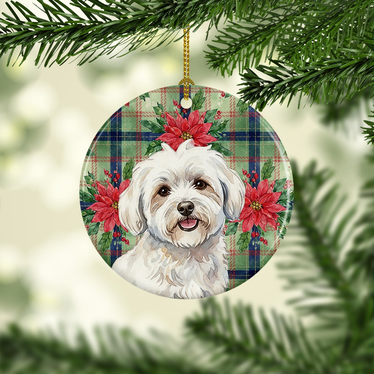 Ceramic Ornament featuring breed specific Coton de Tulear artwork. Celebrate Christmas with this Christmas Ornament. Add a touch of personalized charm to your Christmas tree this holiday season with our Ceramic Ornament. Measuring 2.8125 inches in diameter, this round porcelain ornament beautifully reflects your festive lights, enhancing your holiday decor. The gloss surface sets off the vibrant, full-color artwork contributed by one of our talented artists, bringing a pop of color and joy to your tree. This Ceramic Ornament doesn't stop at being merely decorative. The white back is designed for personalization. Write a heartfelt message, mark a special year, or inscribe a date with a paint pen or a permanent marker to create a treasured memento. Please ensure you allow any personalization to dry thoroughly before handling to maintain the pristine finish. Included with the ornament is a delicate gold cord for easy hanging. Made in the USA, this Ceramic Ornament makes an exceptional gift for a pet sitter, teacher, family member, or anyone you wish to share a little Christmas magic with. With its blend of style, charm, and personal touch, it's a meaningful addition to any Christmas tree.