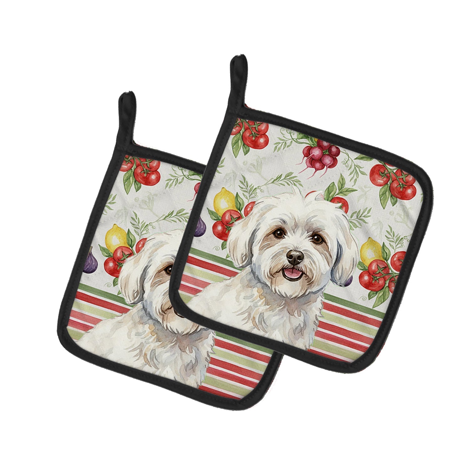 Pair of Pot Holders featuring breed specific Coton de Tulear artwork. Add warmth, personality, and function to your kitchen with our Vegetables Pot Holder Pair. Each set includes two quilted hot pads, featuring original full-color watercolor artwork on a soft polyester front accented by black trim. Crafted with multiple layers for performance: Top Layer: Vibrant artwork permanently dyed into polyester fabric. Middle Layer: US-manufactured insulated material with breathable polyester fibers and a reflective metalized film that reflects heat back to its source. Bottom Layer: A silver heat-resistant backing for extra protection. Each pot holder measures 7.5" x 7.5", includes a hanging tab, and is quilted for durability. Use them to protect your hands, countertops, and tabletops — or as decorative trivets for Thanksgiving, Christmas, or everyday meals.