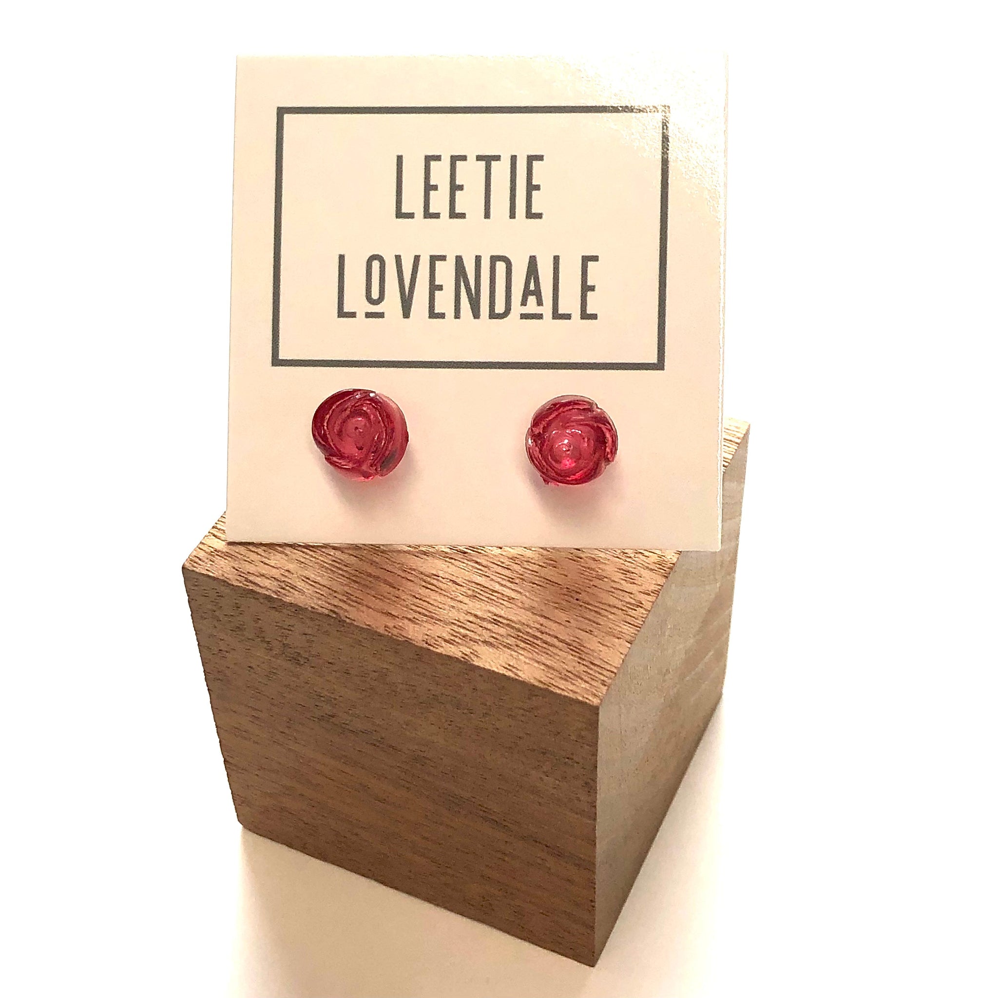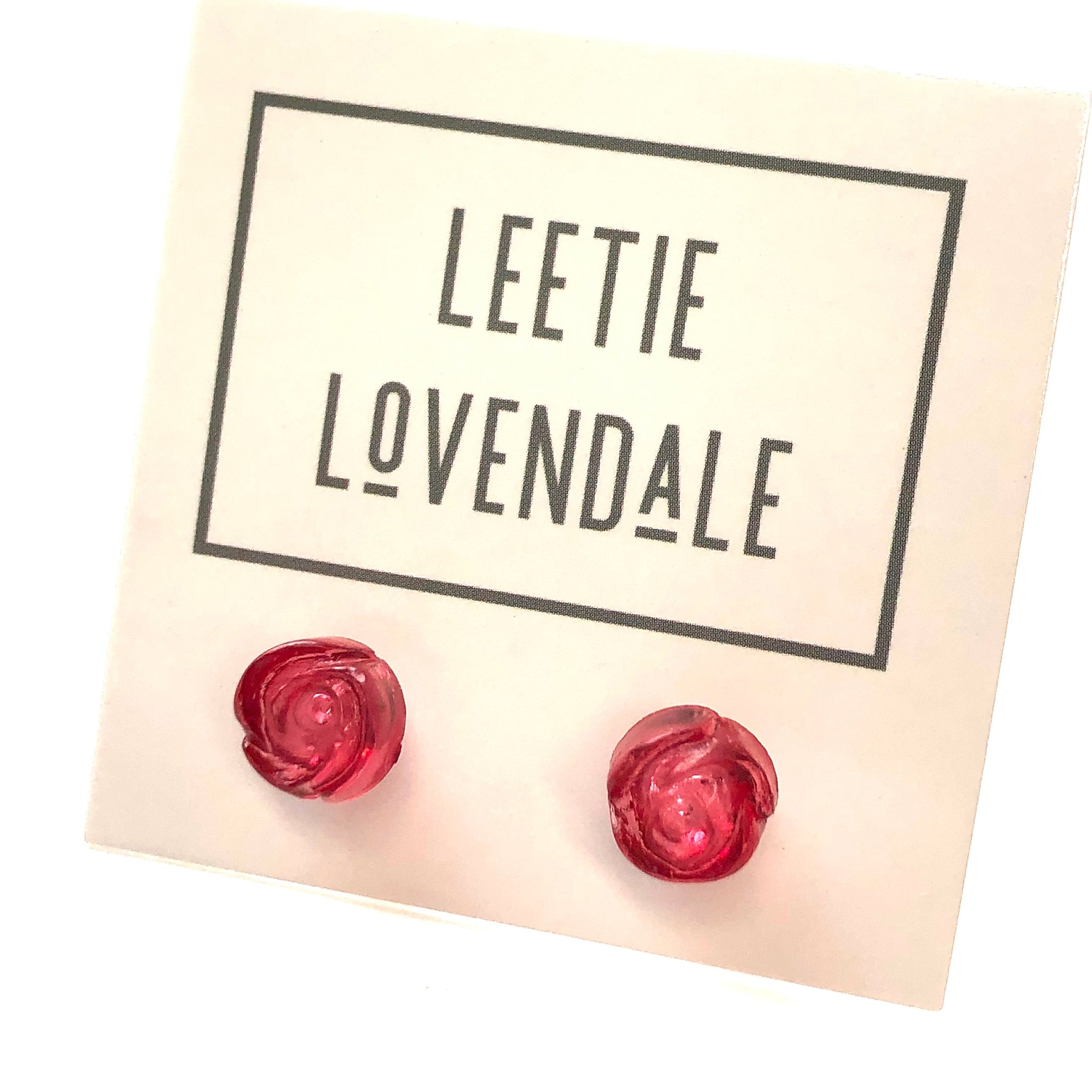 Cranberry stud earrings in incredible carved rose shapes. Each measures about 9mm in diameter, and is a great romantic styled shape. Light weight & in a rare floral find for our line.
