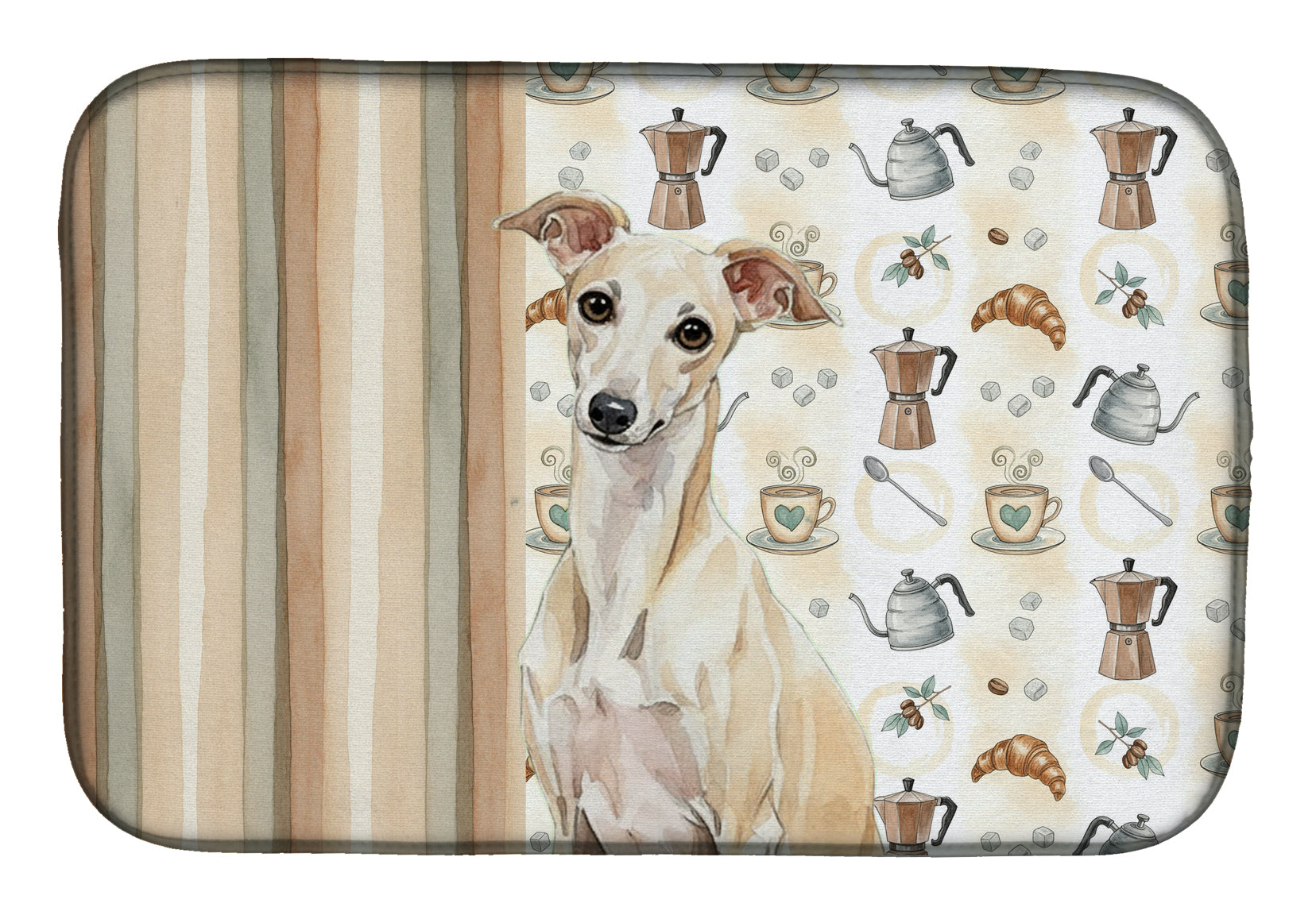 Shown here is the Cream Italian Greyhound Coffee Bar Dish Drying Mat from Caroline's Treasures featuring artwork of a Italian Greyhound in a Everyday design. The detailed illustration and vibrant colors make it a standout accent that celebrates both seasonal style and love for the subject. This image features a cozy watercolor coffee-themed pattern with illustrated mugs, moka pots, kettles, croissants, coffee beans, and sugar cubes arranged in a repeating design. Soft neutral tones with warm browns, creams, and subtle sage accents create an inviting, café-inspired look that feels comforting and relaxed. Everyday décor celebrates personal style and the small moments that make a house feel like home. Thoughtful designs add warmth and personality that can be enjoyed year-round. Say goodbye to messy countertops and soggy dish towels with our innovative dish drying mat. Our high-quality dish drying pad is designed to keep your countertops dry while offering a stylish and efficient solution. Whether you're air drying dishes, glasses, stemware, silverware, pots, pans, bottles, or even fruits and vegetables, our dish mat is the perfect choice. The 14 inches x 21 inches size fits most counters and dish drying racks, and the non-slip design ensures stability. Made with water-absorbent polyester and a polyurethane foam insert, our dish drying mat is not only functional but also durable. It's machine washable and printed in the USA for long-lasting use. The beautiful artwork adds flair to your kitchen decor, making it a perfect housewarming gift or present for any occasion. Upgrade your kitchen experience with our absorbent and versatile dish drying mat. Perfect for: Kitchen counters and sinks, everyday dish drying and countertop protection, Dogs-themed homes, or year-round use for Italian Greyhound lovers. Italian Greyhounds are graceful companion dogs known for their slender build and affectionate nature. This elegant breed is cherished for its sensitivity, loyalty, and love of comfort. Makes a heartfelt gift for: Italian Greyhound owners, Dogs lovers, Everyday gifts, pet parents, friends who adore their Italian Greyhound, or anyone celebrating Dogs.