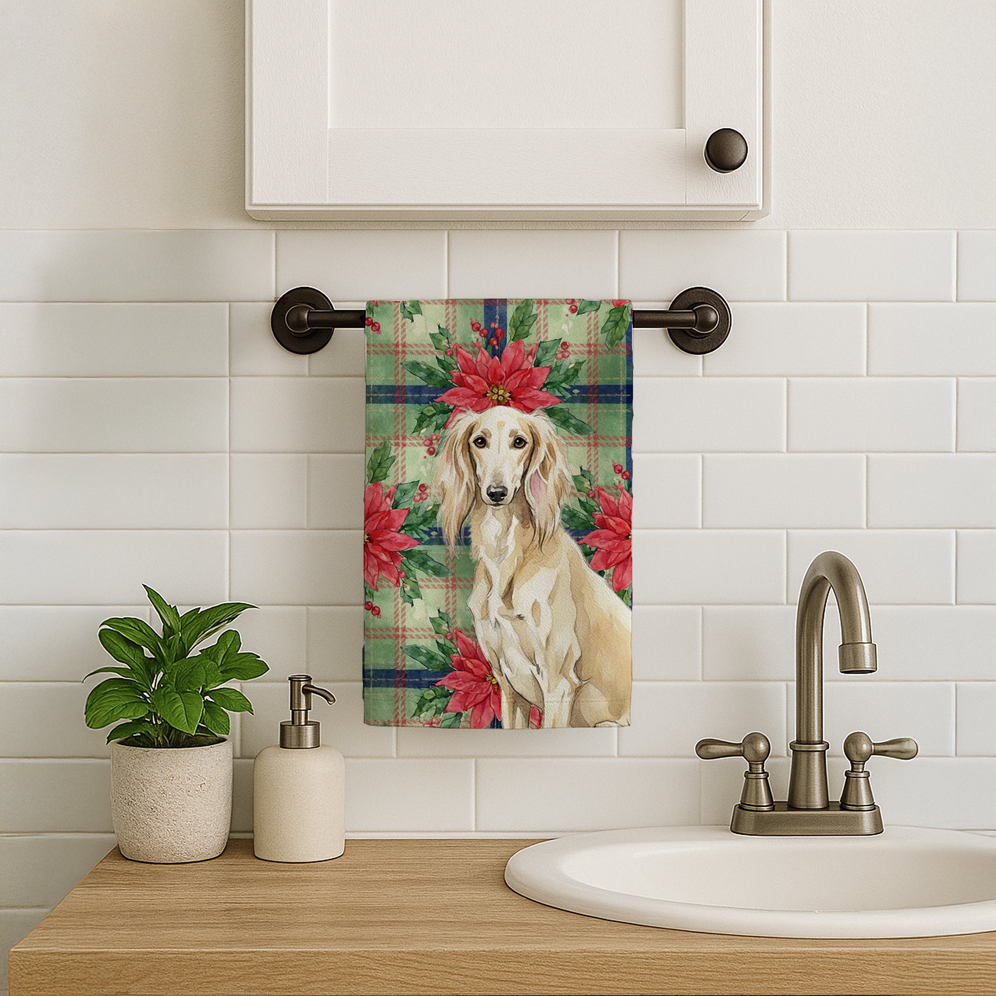Kitchen Towel featuring breed specific Saluki artwork. Celebrate Christmas with this Christmas Kitchen Towel. Bring cozy holiay charm to your sink or powder room with a plush velour towel featuring original watercolor artwork. The front is a soft, color-rich minky polyester that polishes glassware to a brilliant shine; the back is 100% white cotton terry loop for quick absorbency on hands, dishes, and counters. Artwork is dyed into the fibers for lasting color that won’t crack or peel. Finished edges keep the shape wash after wash. Size: 15" x 25". Machine wash; tumble dry low. Designed and printed in the USA.