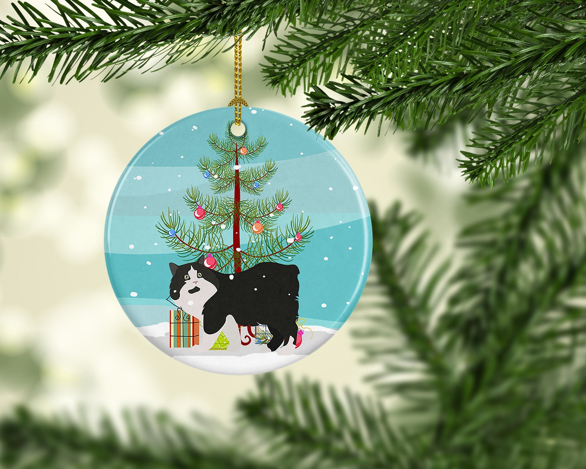 Decorate your space with our Christmas Cymric artwork on a Ornament. Add a touch of personalized charm to your Christmas tree this holiday season with our Ceramic Ornament. Measuring 2.8125 inches in diameter, this round porcelain ornament beautifully reflects your festive lights, enhancing your holiday decor. The gloss surface sets off the vibrant, full-color artwork contributed by one of our talented artists, bringing a pop of color and joy to your tree. This Ceramic Ornament doesn't stop at being merely decorative. The white back is designed for personalization. Write a heartfelt message, mark a special year, or inscribe a date with a paint pen or a permanent marker to create a treasured memento. Please ensure you allow any personalization to dry thoroughly before handling to maintain the pristine finish. Included with the ornament is a delicate gold cord for easy hanging. Made in the USA, this Ceramic Ornament makes an exceptional gift for a pet sitter, teacher, family member, or anyone you wish to share a little Christmas magic with. With its blend of style, charm, and personal touch, it's a meaningful addition to any Christmas tree.