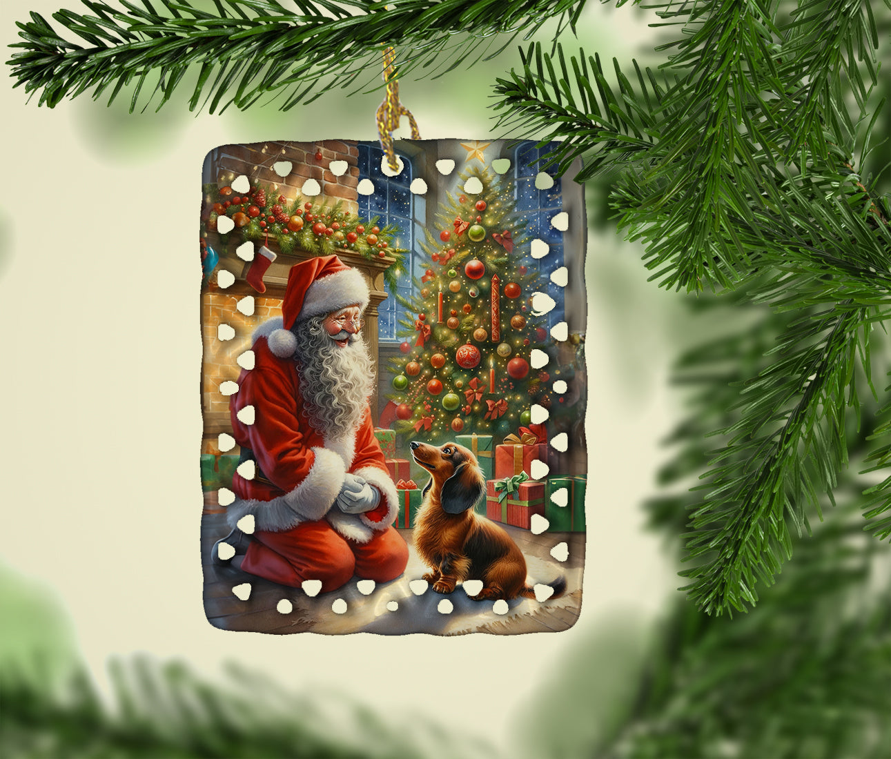 Porcelain Ornament featuring breed specific Dachshund artwork. Celebrate Christmas with this Christmas Ornament. Add a unique, personal touch to your holiday decor with our Rectangular Lattice Porcelain Ornament. Perfect for creating cherished memories, this high-quality ornament shines under festive lights, reflecting warmth and joy throughout your Christmas tree. Crafted with a glossy finish, it showcases vibrant, full-color artwork contributed by our talented artists, ensuring your tree is adorned with a burst of color and holiday spirit. What sets this Porcelain Ornament apart is its customizable white back. Use a paint pen or permanent marker to write a heartfelt message, commemorate a special year, or mark an unforgettable date, turning this ornament into a keepsake that will be treasured for years to come. For best results, allow any personalization to dry thoroughly before handling. Each ornament comes complete with a delicate gold cord, making it easy to hang and display. Proudly made in the USA, this ornament measures 3.375 x 2.625 inches and is a thoughtful gift for pet sitters, teachers, family members, or anyone who would appreciate a little extra holiday magic. Bring style, charm, and a touch of personal meaning to your Christmas tree with this beautifully designed ornament..