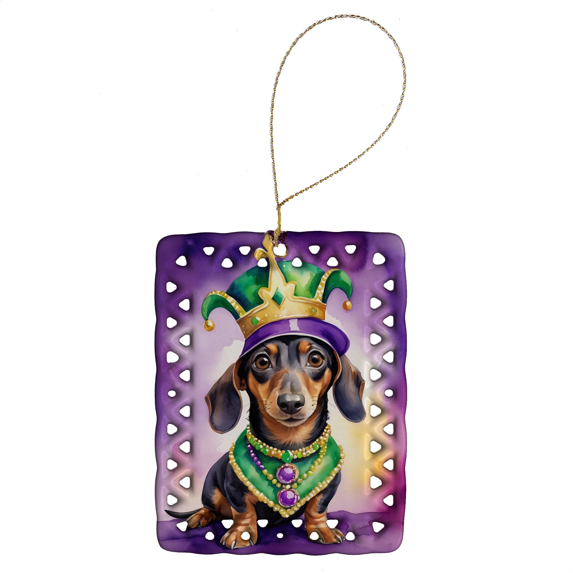 Porcelain Ornament featuring breed specific Dachshund artwork. Celebrate Mardi Gras with this Mardi Gras Ornament. Add a unique, personal touch to your holiday decor with our Rectangular Lattice Porcelain Ornament. Perfect for creating cherished memories, this high-quality ornament shines under festive lights, reflecting warmth and joy throughout your Christmas tree. Crafted with a glossy finish, it showcases vibrant, full-color artwork contributed by our talented artists, ensuring your tree is adorned with a burst of color and holiday spirit. What sets this Porcelain Ornament apart is its customizable white back. Use a paint pen or permanent marker to write a heartfelt message, commemorate a special year, or mark an unforgettable date, turning this ornament into a keepsake that will be treasured for years to come. For best results, allow any personalization to dry thoroughly before handling. Each ornament comes complete with a delicate gold cord, making it easy to hang and display. Proudly made in the USA, this ornament measures 3.375 x 2.625 inches and is a thoughtful gift for pet sitters, teachers, family members, or anyone who would appreciate a little extra holiday magic. Bring style, charm, and a touch of personal meaning to your Christmas tree with this beautifully designed ornament..
