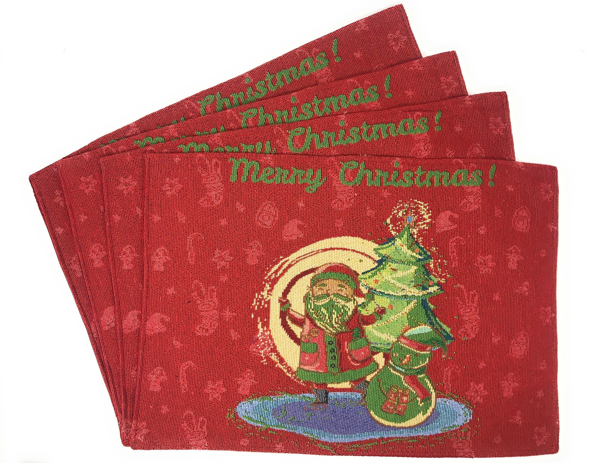 Brighten up your dining table with our one of a kind vibrant red "Merry Christmas" Santa Clause DaDa Bedding table tapestry sets this holiday season.