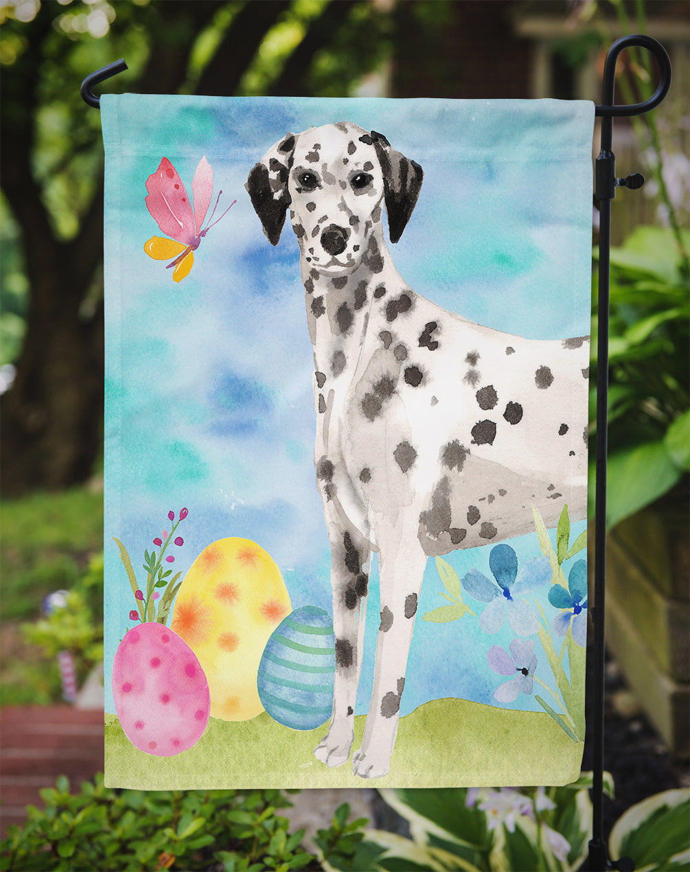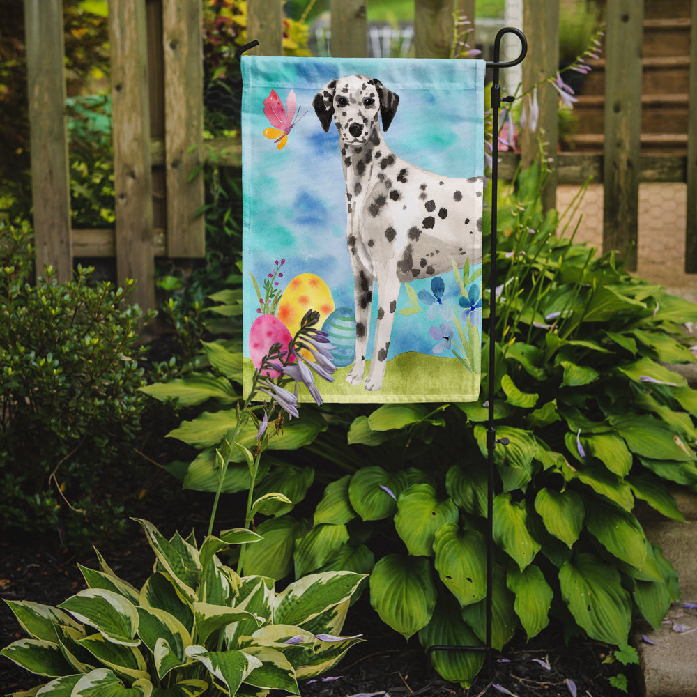 Decorate your space with our Easter Dalmatian artwork on a Garden Flag. Enhance the beauty of your garden, patio, or yard with Caroline's Treasures Decorative Garden Flag, proudly made in the USA. Crafted from two pieces of thick, double-sided polyester fabric, this 2-ply garden flag is designed to withstand various weather conditions, making it water-resistant and weatherproof. Featuring correctly readable words on both sides, this garden flag offers a delightful visual experience from any angle. With its heavier weight, it stands out among other garden flags, ensuring stability and durability even in wind, rain, and snow. Measuring approximately 11 1/4 inches by 15 1/2 inches, this flag allows you to personalize your outdoor decor. It comes with a 1 1/2-inch sleeve sewn in, allowing easy attachment to any standard garden flag stand or garden size porch hanger (sold separately). Make a statement in your outdoor space with Caroline's Treasures Decorative Garden Flag, a vibrant and high-quality flag that adds color and personality to your surroundings. Proudly made in the USA, it's a symbol of quality craftsmanship and attention to detail.