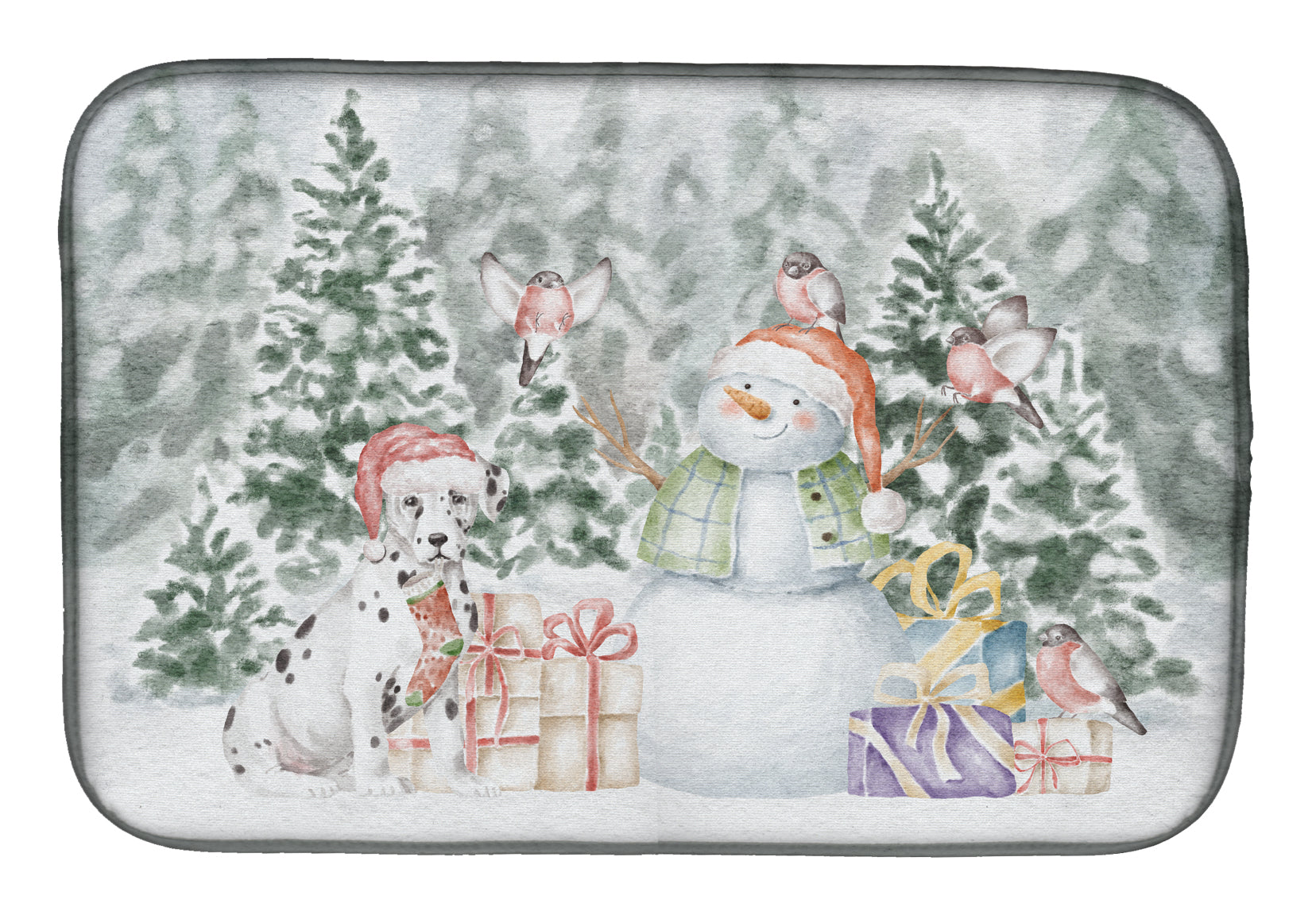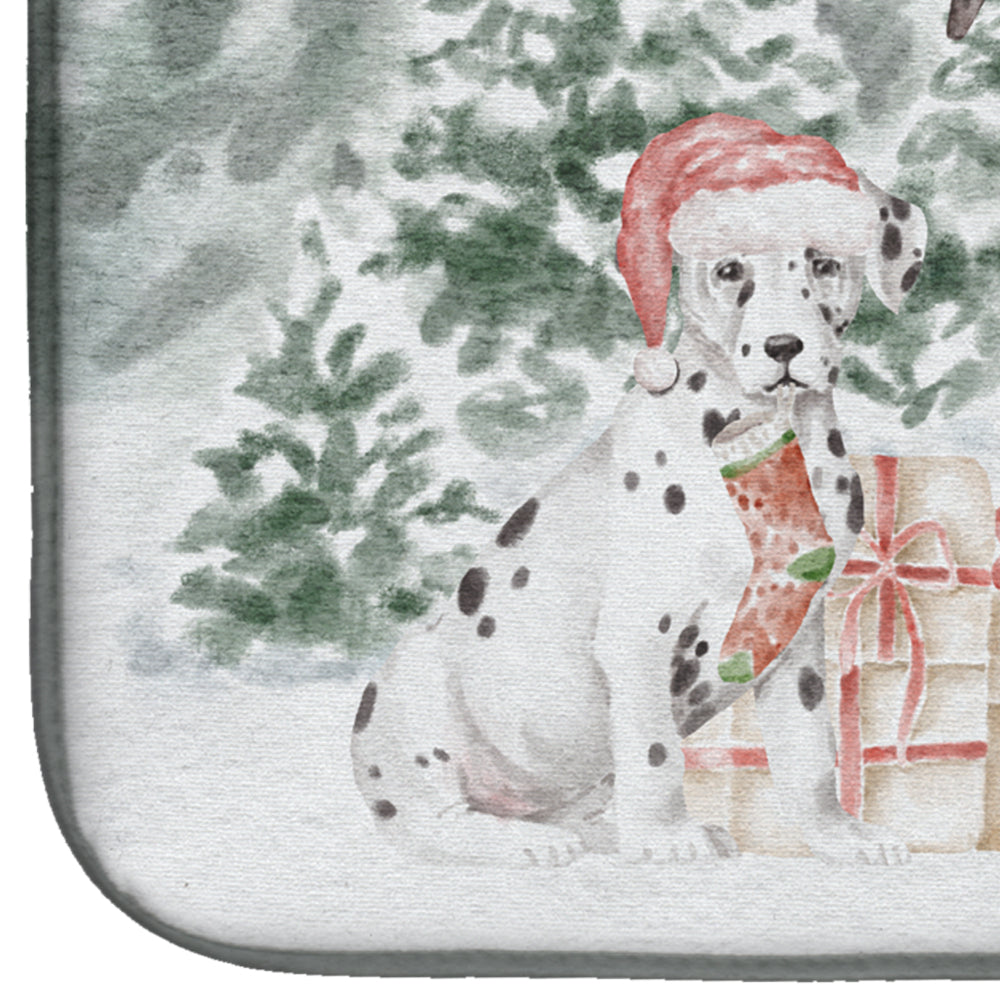 Decorate your space with our Christmas Dalmatian artwork on a Dish Drying Mat. Say goodbye to messy countertops and soggy dish towels with our innovative dish drying mat. Our high-quality dish drying pad is designed to keep your countertops dry while offering a stylish and efficient solution. Whether you're air drying dishes, glasses, stemware, silverware, pots, pans, bottles, or even fruits and vegetables, our dish mat is the perfect choice. The 14 inches x 22 inches size fits most counters and dish drying racks, and the non-slip design ensures stability. Made with water-absorbent polyester and a polyurethane foam insert, our dish drying mat is not only functional but also durable. It's machine washable and printed in the USA for long-lasting use. The beautiful artwork adds flair to your kitchen decor, making it a perfect housewarming gift or present for any occasion. Upgrade your kitchen experience with our absorbent and versatile dish drying mat.