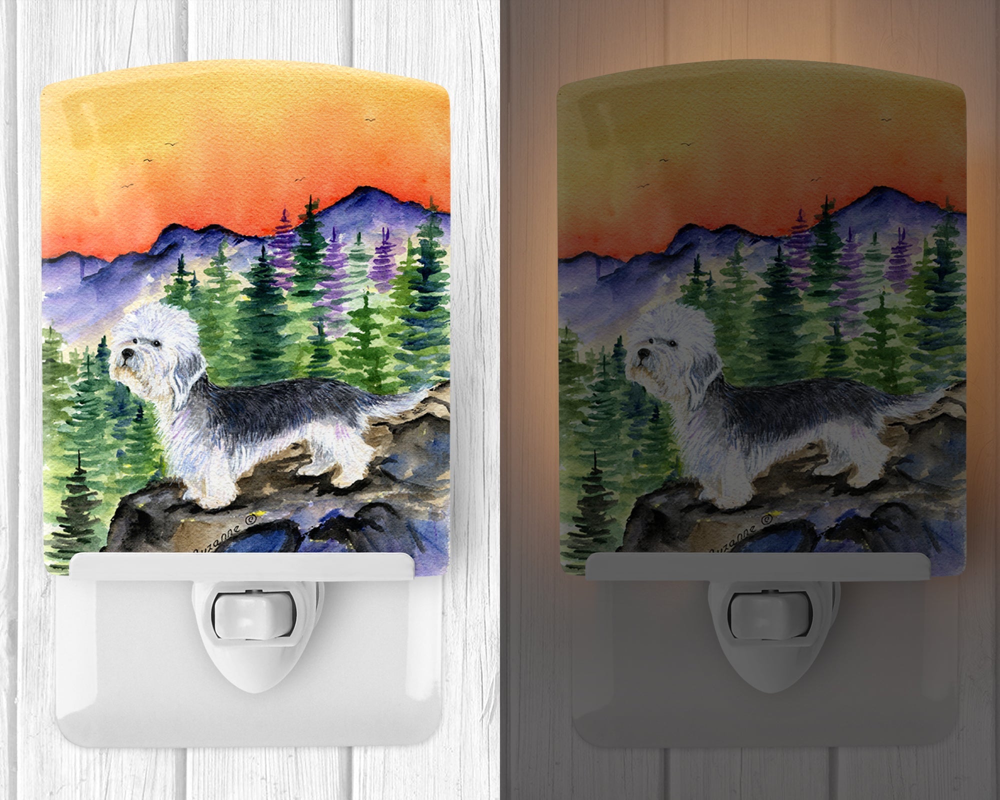 Decorate your space with our Dandie Dinmont Terrier artwork on a Night Light. Introduce a splash of artistic flair and subtle illumination to your space with the Decorative Ceramic Night Light from Caroline's Treasures. Perfect for any room, this night light seamlessly blends functionality with an aesthetic appeal, offering a stylish solution to brighten up dark corners of your home or office. Boasting a six-inch high by four-inch wide ceramic tile at the front, it showcases vivid, full-color artwork from distinguished artists, transforming a simple utility into a vibrant art piece. The artwork is securely encased in a robust metal holder, ensuring durability and longevity. Two screws are provided to firmly affix the tile into the holder. The holder extends three inches deep, housing an included bulb that emits a soft, welcoming glow. This product meets all safety standards, as evidenced by its UL approval. Proudly made in the United States from imported components, this Decorative Ceramic Night Light is not just a functional device; it's a statement piece that enhances the ambiance of your surroundings.