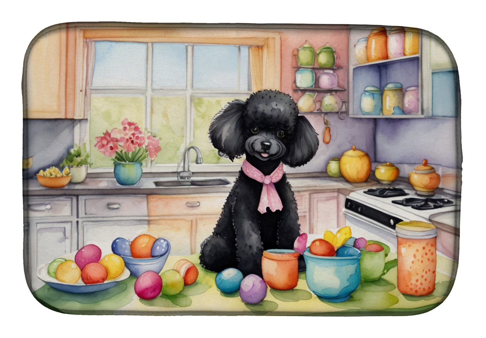 Dish Drying Mat featuring breed specific Poodle artwork. Celebrate Easter with this Easter Dish Drying Mat. Say goodbye to messy countertops and soggy dish towels with our innovative dish drying mat. Our high-quality dish drying pad is designed to keep your countertops dry while offering a stylish and efficient solution. Whether you're air drying dishes, glasses, stemware, silverware, pots, pans, bottles, or even fruits and vegetables, our dish mat is the perfect choice. The 14 inches x 22 inches size fits most counters and dish drying racks, and the non-slip design ensures stability. Made with water-absorbent polyester and a polyurethane foam insert, our dish drying mat is not only functional but also durable. It's machine washable and printed in the USA for long-lasting use. The beautiful artwork adds flair to your kitchen decor, making it a perfect housewarming gift or present for any occasion. Upgrade your kitchen experience with our absorbent and versatile dish drying mat.