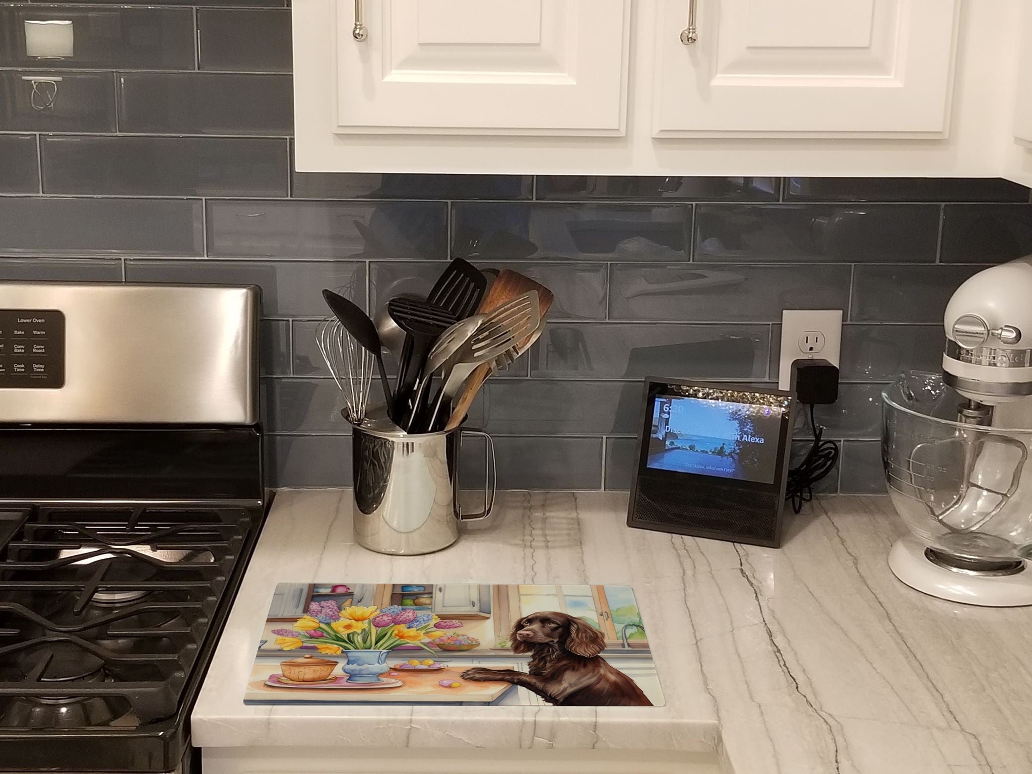 Decorate your space with our Easter Boykin Spaniel artwork on a Cutting Board. Introduce your kitchen to the vibrant, large Decorative Glass Cutting Board from Caroline's Treasures. Crafted from resilient tempered glass, this board is not only a utilitarian necessity but also a colorful art piece. With its generous dimensions of 15 inches in height and 12 inches in length, it offers ample space for all your cutting needs. Every piece showcases captivating artwork from distinguished artists, bringing an aesthetic edge to your kitchen. Beyond its attractive design, this cutting board ensures your countertop stays pristine and unscathed, owing to its heat-resistant properties. Engineered with user convenience in mind, it features non-skid feet for stability, and rounded corners for additional safety. Its robust construction renders it virtually unbreakable, guaranteeing longevity. The board comes with protective feet bumpers, maintaining its position during use. This product is recommended to be hand washed only. Proudly printed and assembled in the United States, this cutting board exemplifies superior craftsmanship. With Caroline's Treasures' Decorative Glass Cutting Board, you're investing in a blend of functionality and artistic flair.