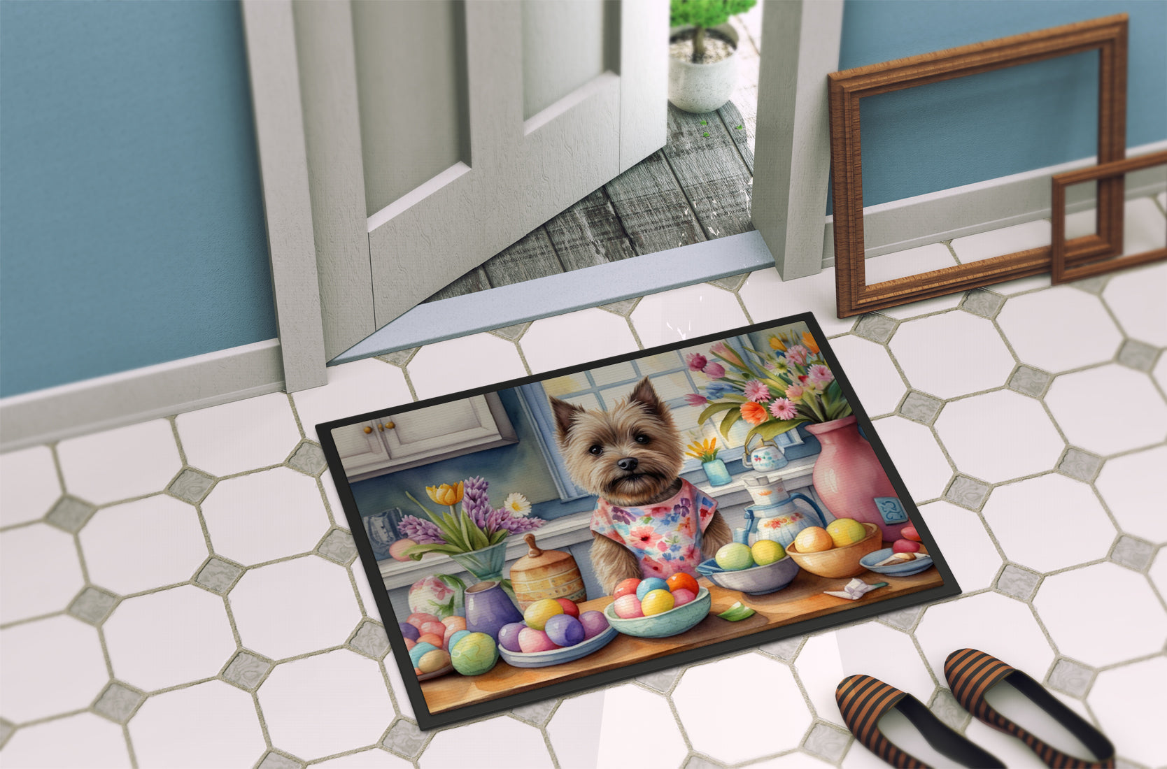 Decorate your space with our Easter Cairn Terrier artwork on a Doormat. Welcome your guests in style with our Artwork Door Mat, designed to withstand almost any weather condition. This mat, measuring approximately 18 by 27 inches, is held together by durable black binding tape. Its top layer, composed of polyester felt, is dyed with the eye-catching image you see on the mat. A few layers below provide the mat with stability, while its rubber bottom is stamped to help prevent slipping and ensures safety. Our mat works wonderfully as both an indoor or outdoor door mat. For cleaning, simply hose it off with water or use a power washer - no need for any cleaner that produces suds. Avoid scrubbing with a brush, instead, opt for the vacuum on floor setting. Designed manufactured and printed in the USA, this mat is a perfect addition to your porch, outdoor kitchen, entryway, or any indoor space. Its unique design makes it a charming decorative rug that greets your guests and adds a stylish touch to your home decor.