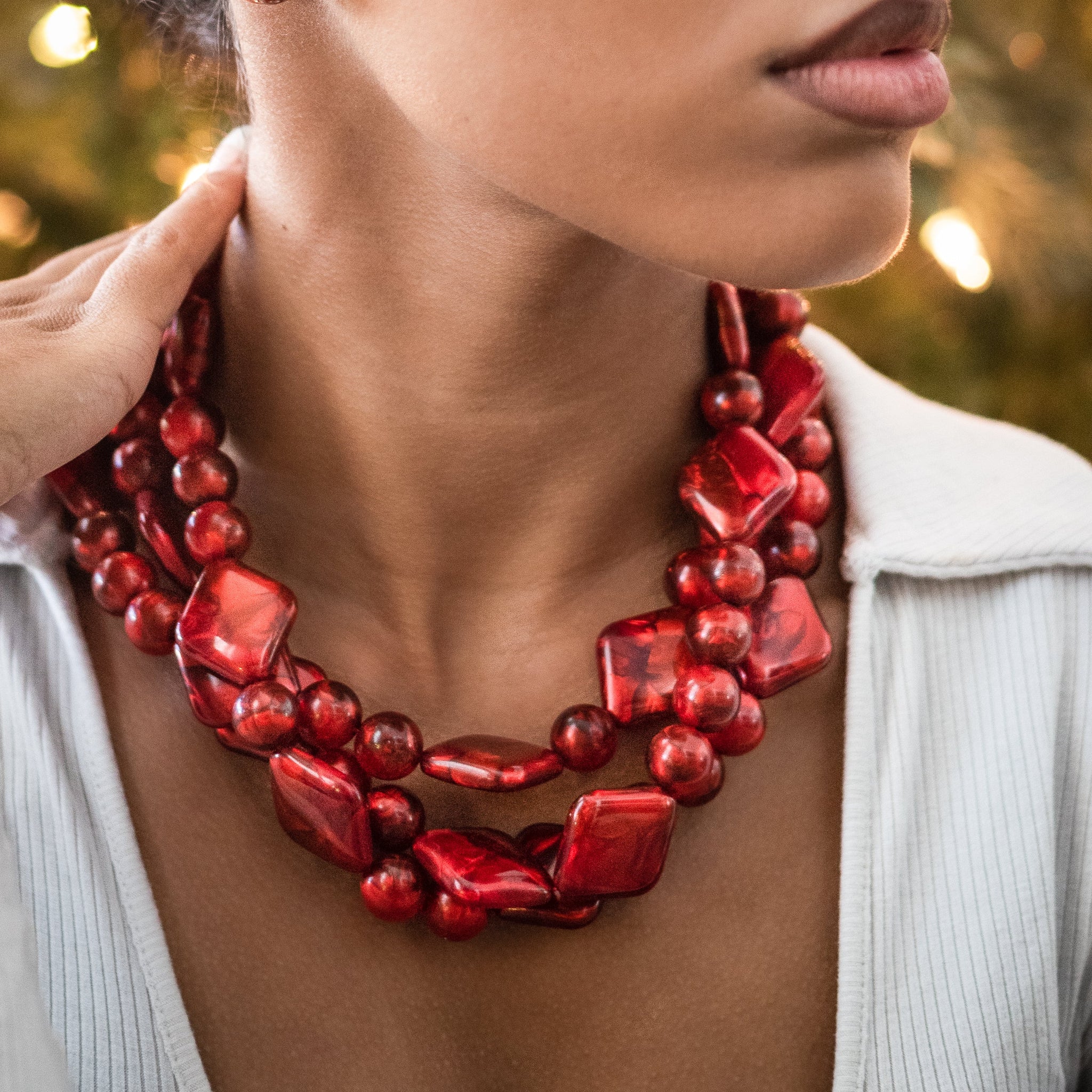 Deep red necklace features vintage beads in an aura glow finish & diamond & round shapes. This 3 strand statement necklace style is known as the Morgan Necklace. Beads were made in the 1960's. Necklace measures 15.5-16" at its shortest + a 6" extender. Lightweight and fun to wear: a classic style that will outlast trends.