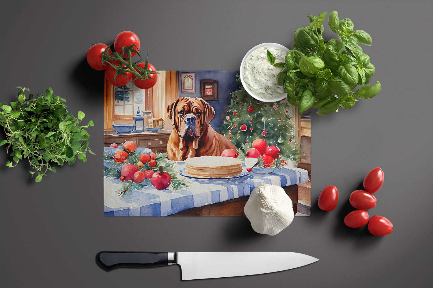 Decorate your space with our Christmas Dogue de Bordeaux artwork on a Cutting Board. Introduce your kitchen to the vibrant, large Decorative Glass Cutting Board from Caroline's Treasures. Crafted from resilient tempered glass, this board is not only a utilitarian necessity but also a colorful art piece. With its generous dimensions of 15 inches in height and 12 inches in length, it offers ample space for all your cutting needs. Every piece showcases captivating artwork from distinguished artists, bringing an aesthetic edge to your kitchen. Beyond its attractive design, this cutting board ensures your countertop stays pristine and unscathed, owing to its heat-resistant properties. Engineered with user convenience in mind, it features non-skid feet for stability, and rounded corners for additional safety. Its robust construction renders it virtually unbreakable, guaranteeing longevity. The board comes with protective feet bumpers, maintaining its position during use. This product is recommended to be hand washed only. Proudly printed and assembled in the United States, this cutting board exemplifies superior craftsmanship. With Caroline's Treasures' Decorative Glass Cutting Board, you're investing in a blend of functionality and artistic flair.