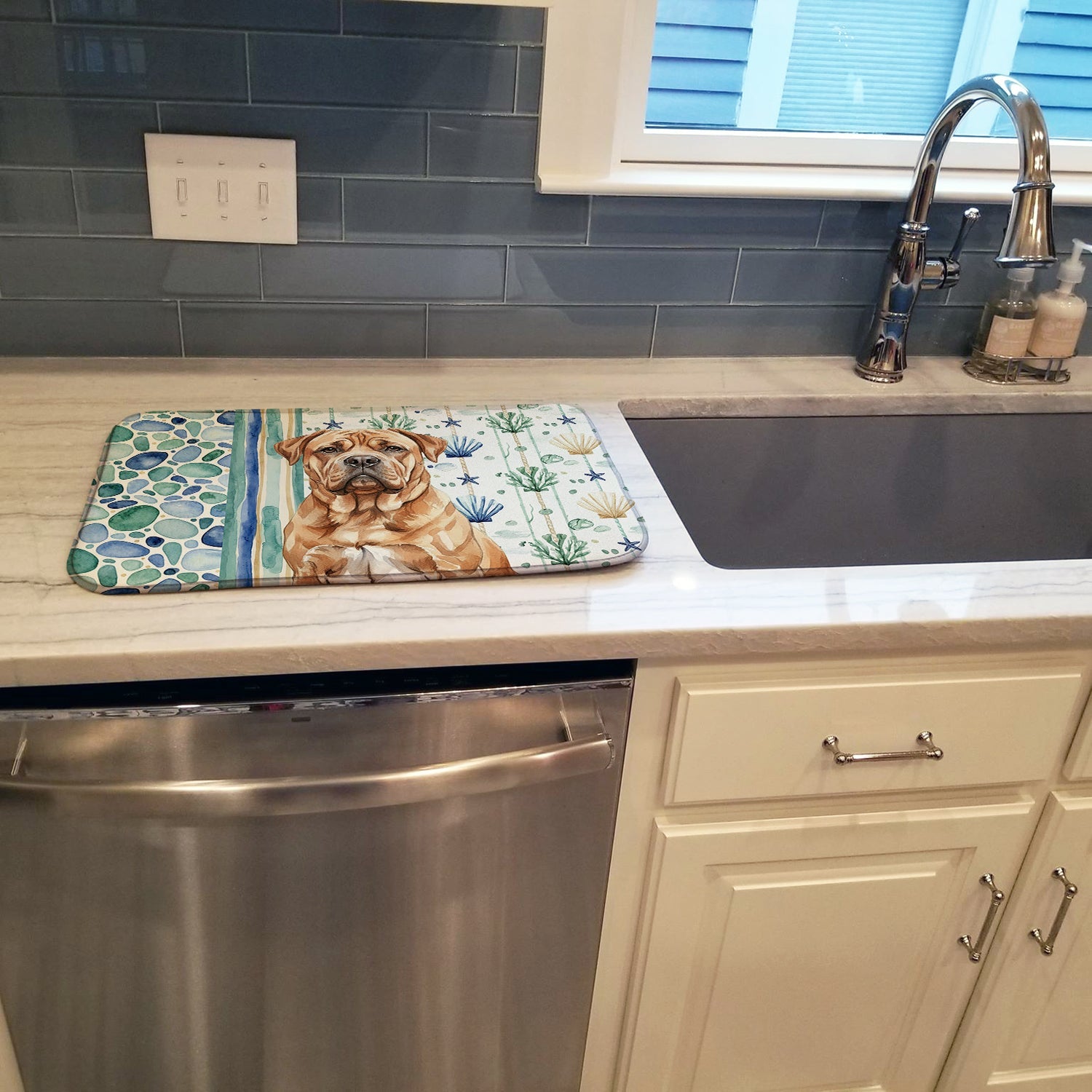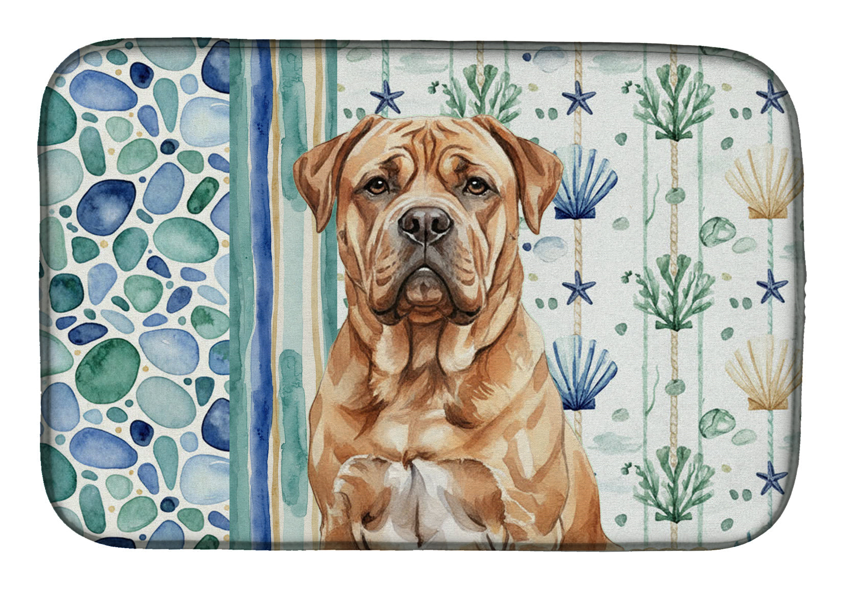 Shown here is the Dogue de Bordeaux Coastal Sea Glass Dish Drying Mat from Caroline's Treasures featuring artwork of a Dogue de Bordeaux in a Everyday design. The detailed illustration and vibrant colors make it a standout accent that celebrates both seasonal style and love for the subject. This image features a calming coastal watercolor pattern with soft seashells, seaweed, starfish, and pebble-inspired accents arranged in a repeating design. The soothing palette of blues, greens, and sandy neutrals creates a relaxed, beach-inspired look that adds a fresh and tranquil feel to any space. Everyday décor celebrates personal style and the small moments that make a house feel like home. Thoughtful designs add warmth and personality that can be enjoyed year-round. Say goodbye to messy countertops and soggy dish towels with our innovative dish drying mat. Our high-quality dish drying pad is designed to keep your countertops dry while offering a stylish and efficient solution. Whether you're air drying dishes, glasses, stemware, silverware, pots, pans, bottles, or even fruits and vegetables, our dish mat is the perfect choice. The 14 inches x 21 inches size fits most counters and dish drying racks, and the non-slip design ensures stability. Made with water-absorbent polyester and a polyurethane foam insert, our dish drying mat is not only functional but also durable. It's machine washable and printed in the USA for long-lasting use. The beautiful artwork adds flair to your kitchen decor, making it a perfect housewarming gift or present for any occasion. Upgrade your kitchen experience with our absorbent and versatile dish drying mat. Perfect for: Kitchen counters and sinks, everyday dish drying and countertop protection, Dogs-themed homes, or year-round use for Dogue de Bordeaux lovers. Dogue de Bordeaux dogs are powerful mastiffs known for their strength and calm demeanor. This French breed is admired for its loyalty, confidence, and steady temperament. Makes a heartfelt gift for: Dogue de Bordeaux owners, Dogs lovers, Everyday gifts, pet parents, friends who adore their Dogue de Bordeaux, or anyone celebrating Dogs.