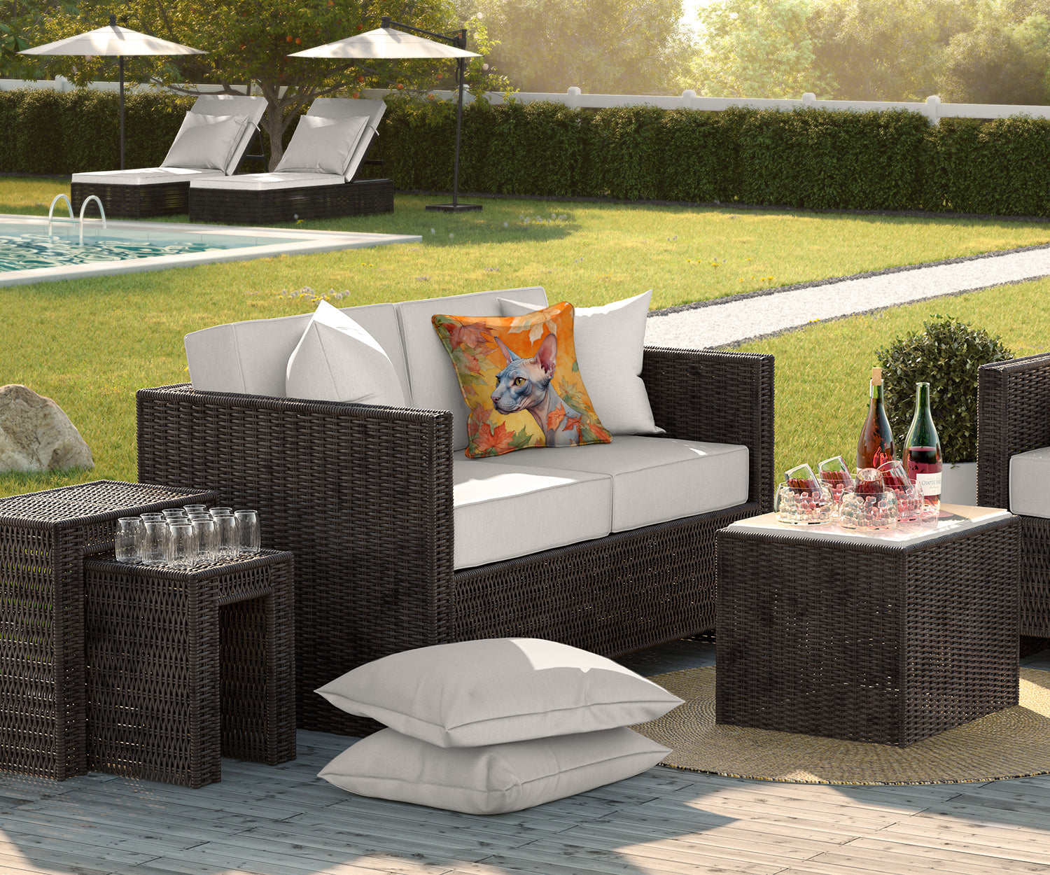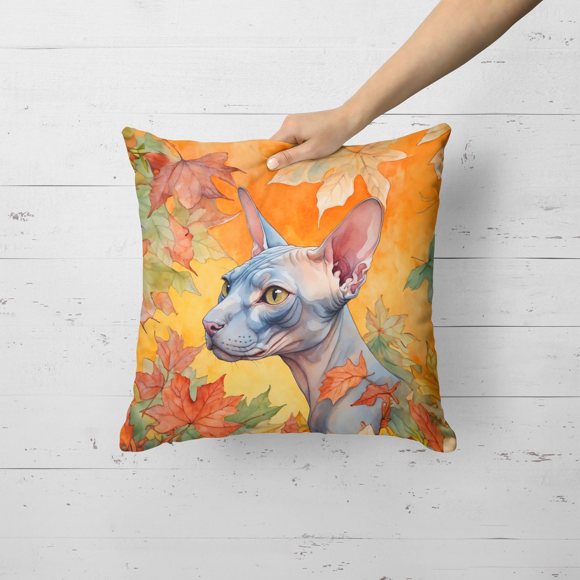 Throw Pillow featuring breed specific Donskoy Don Sphynx artwork. Celebrate Halloween with this Halloween Pillow. Revitalize your outdoor or indoor living space with Caroline's Treasures 18x18 Fabric Decorative Pillow. With a generously sized dimension of approximately 18 inches by 18 inches, this pillow makes a comfortable and aesthetic addition to any seating area. Made from a unique, water-resistant material developed by Caroline's Treasures, the pillow sham is 100% polyester fabric that's durable and ready to weather any condition. Its vibrant, full-color artwork will not fade over time as it is dyed with color-fast dyes. Whether you place it on your patio furniture, porch, veranda, or indoor couch, its soft canvas fabric ensures a cozy experience. The pillow is handcrafted in the United States, featuring a sham created from three pieces of fabric and a polyester insert for enduring shape and overstuffed comfort. Despite being robustly built to endure the outdoors, it is as soft and snug as your favorite indoor cushions. Please note, as all our pillows are handmade, sizes may vary slightly, adding to the charm of this unique decorative item.