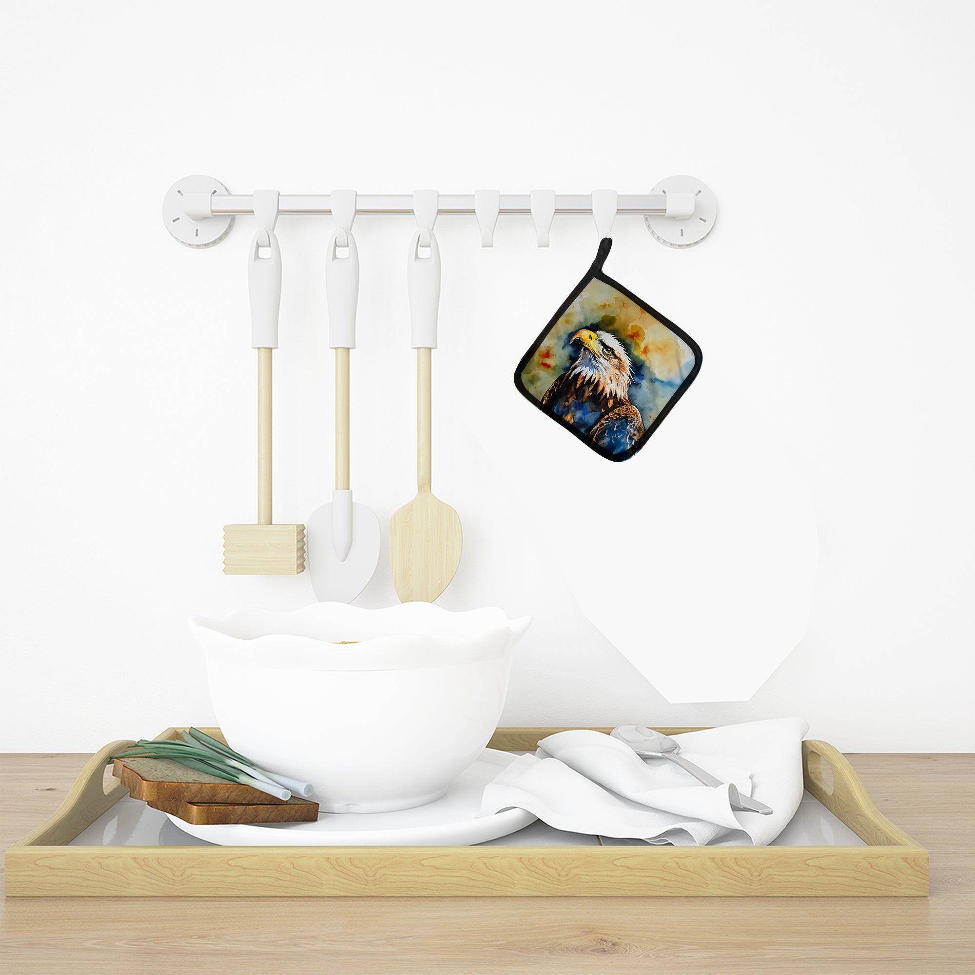 Pair of Pot Holders featuring breed specific Eagle artwork. A Pair of Pot Holders to match your kitchen decor. Made in the USA these are thick and functional. Full color artwork decorates the front polyester fabric of the hot pad and accented by a black trim. Use these at as a trivet for your Thanksgiving or Christmas tablescape. Filled with insulated fabric and quilted for durability. These colorful pot holders will make a great gift for your favorite home cook or executive chef. Each pot holder measures approximately 7 1/2 inches by 7 1/2 inches. A hanging tab is included.