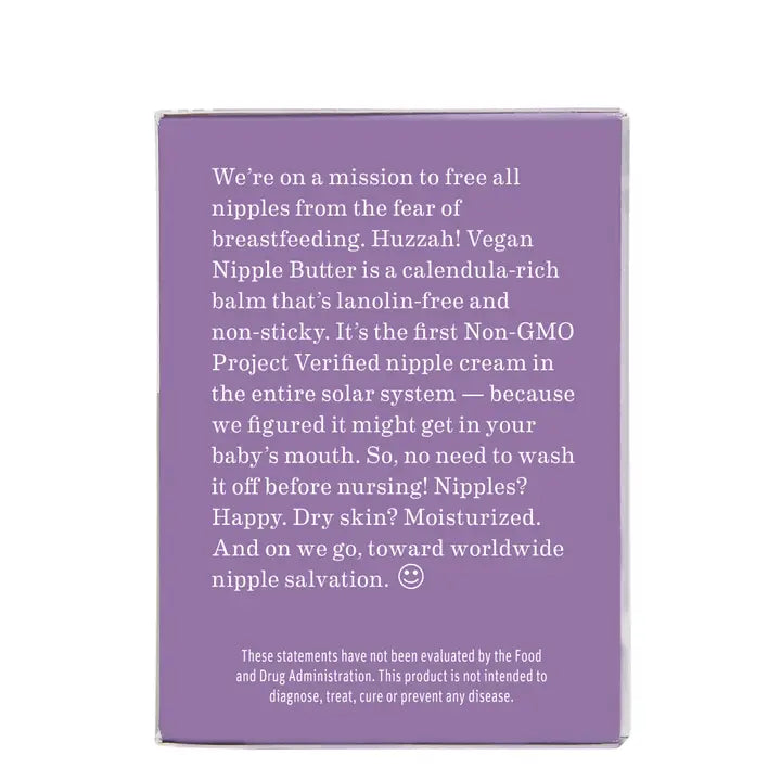 Meet your nipple superhero! Earth Mama Vegan Nipple Butter is a non-sticky, lanolin-free vegan nipple cream that’s Non-GMO Project Verified. This blend of organic calendula and cocoa butter traditionally used to soothe and moisturize dry skin works wonders on sore, cracked nipples and more. That means there’s no need to wash it off before nursing.