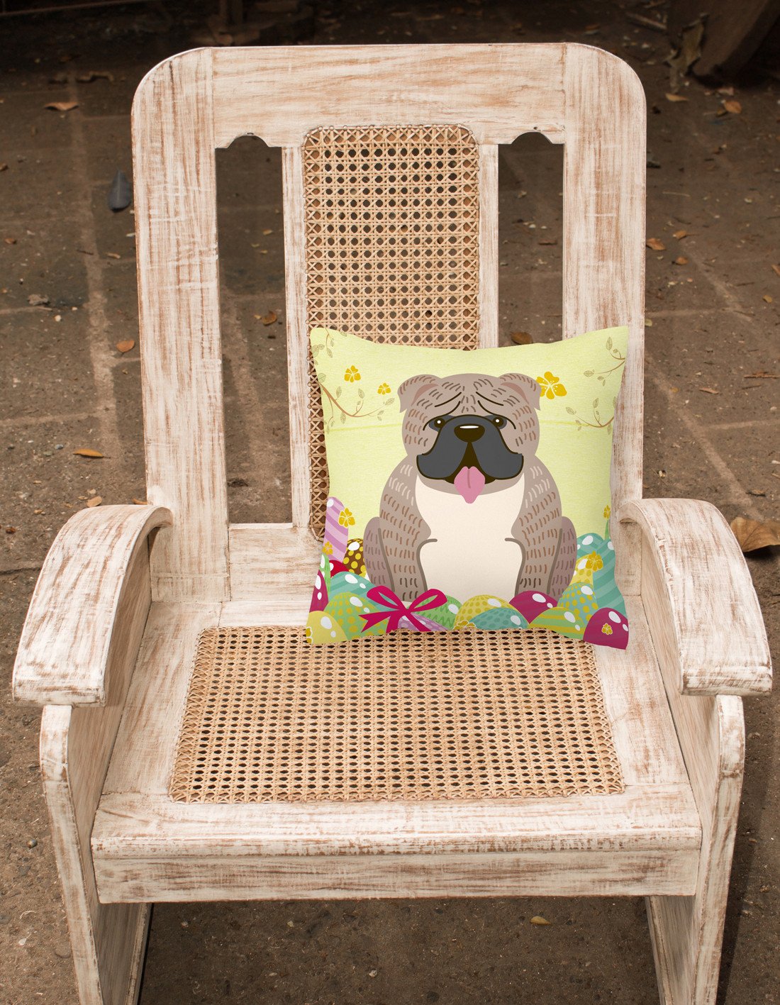 Decorate your space with our Easter Bulldog, English Bulldog artwork on a Pillow. Revitalize your outdoor or indoor living space with Caroline's Treasures 18x18 Fabric Decorative Pillow. With a generously sized dimension of approximately 18 inches by 18 inches, this pillow makes a comfortable and aesthetic addition to any seating area. Made from a unique, water-resistant material developed by Caroline's Treasures, the pillow sham is 100% polyester fabric that's durable and ready to weather any condition. Its vibrant, full-color artwork will not fade over time as it is dyed with color-fast dyes. Whether you place it on your patio furniture, porch, veranda, or indoor couch, its soft canvas fabric ensures a cozy experience. The pillow is handcrafted in the United States, featuring a sham created from three pieces of fabric and a polyester insert for enduring shape and overstuffed comfort. Despite being robustly built to endure the outdoors, it is as soft and snug as your favorite indoor cushions. Please note, as all our pillows are handmade, sizes may vary slightly, adding to the charm of this unique decorative item.