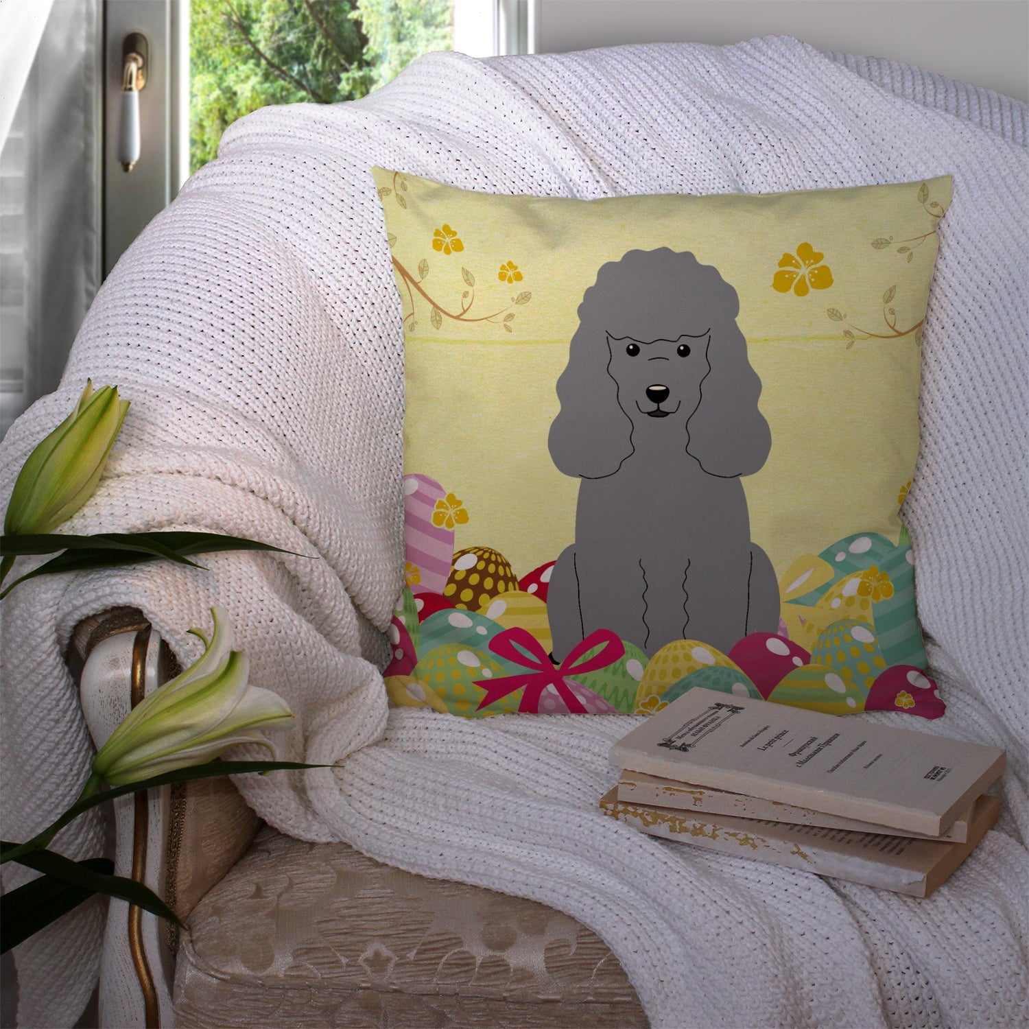 Decorate your space with our Easter Poodle artwork on a Pillow. Add a touch of vibrancy and comfort to your outdoor seating with Caroline's Treasures Fabric Decorative Pillow. Measuring approximately 14 inches by 14 inches, this outdoor pillow is crafted to elevate the appeal of your patio furniture, infusing it with vivid color and artistic flair. The pillow includes a 100% Polyester Fabric sham filled with a quality pillow form to provide superior comfort. Innovatively made from our brand new material, specifically woven for its water resistance, this pillow is designed for durability. The soft canvas fabric offers versatility in use, fit for your indoor couch or your outdoor patio, porch, or veranda. The fabric is dyed with colorfast dyes built for resilience against weather conditions, ensuring the pillow retains its beauty over time. Constructed by sewing three fabric pieces to create a sham, the polyester insert is then nestled inside to form the pillow, resulting in an overstuffed pillow that maintains its shape. Both the sham and the pillow insert are proudly made in the United States. As the pillows are handcrafted, there may be minor variations in size, further enhancing their unique charm. Experience comfort in style with Caroline's Treasures Fabric Decorative Pillow.