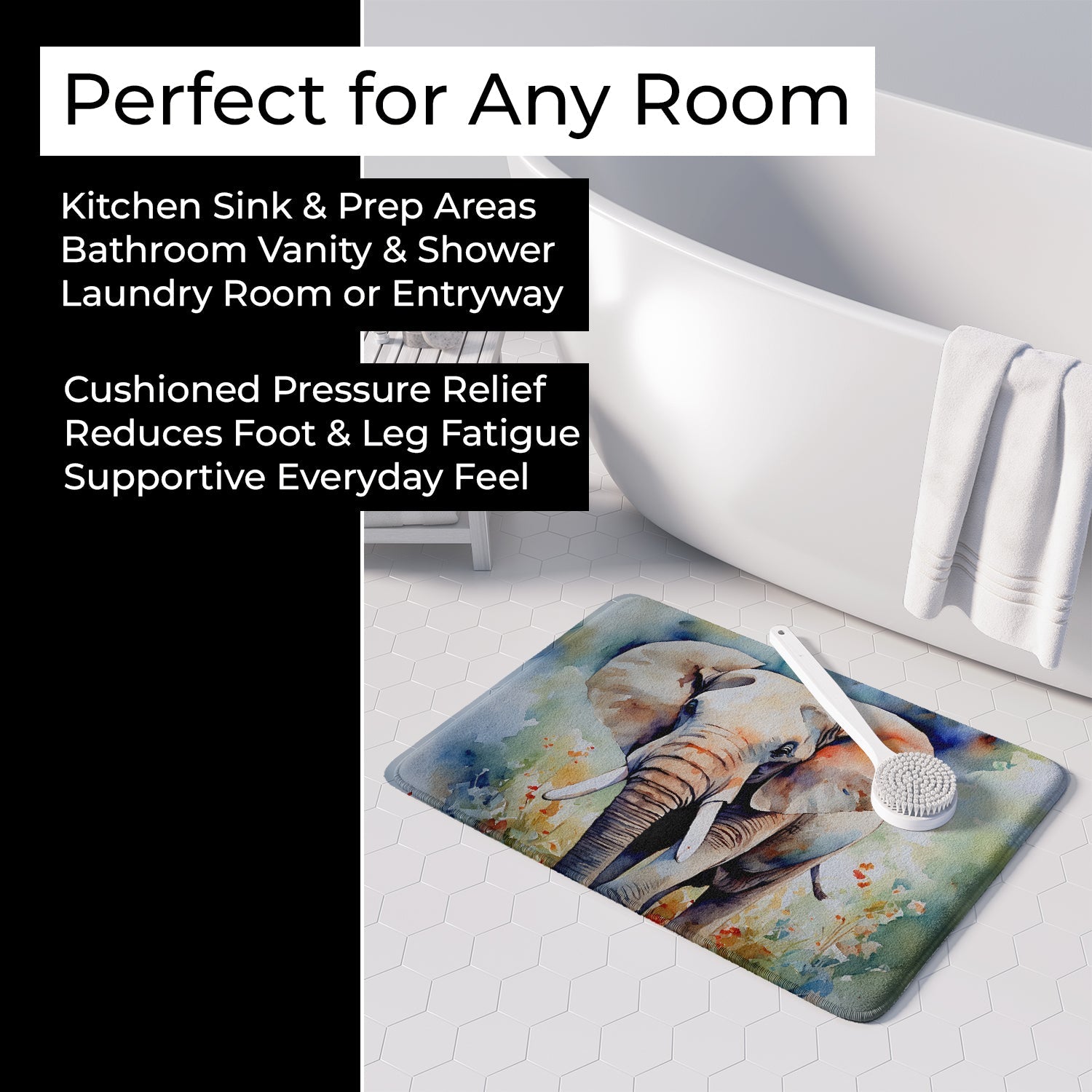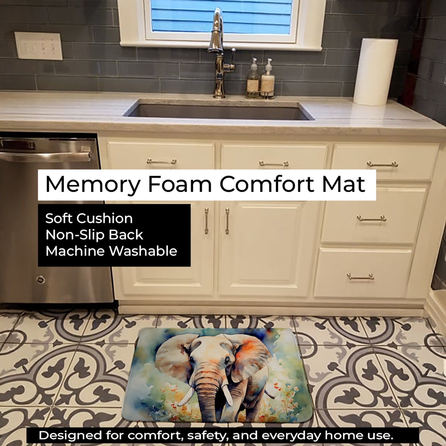 Shown here is the Elephant Memory Foam Kitchen Mat from Caroline's Treasures featuring artwork of a Elephant in a Everyday design. The detailed illustration and vibrant colors make it a standout accent that celebrates both seasonal style and love for the subject. Bring the beauty of nature indoors with our Watercolor Wildlife Collection. Featuring artistic, hand-painted wildlife designs in soft watercolor tones, this collection adds serene charm and uplifting style to home décor and thoughtful gifts for nature lovers. Everyday décor celebrates personal style and the small moments that make a house feel like home. Thoughtful designs add warmth and personality that can be enjoyed year-round. Transform your floor into a work of art with Caroline's Treasures' Memory Foam Mat. This mat offers not only a stunning visual appeal but also a luxurious, plush feel that's incredibly comfortable to the touch. It's a versatile, machine-washable mat designed for both bath and kitchen use, ensuring you experience the best in comfort and convenience. Care Instructions: Maintaining this memory foam mat is a breeze. Simply follow the care instructions on the product tag. It's recommended to wash in cold water and dry on a low-temperature setting in the dryer. This ensures the mat retains its quality and longevity, allowing you to enjoy its beauty and comfort for a long time. Caroline's Treasures' Memory Foam Mat Machine Washable is the perfect blend of artistry, comfort, and practicality, making it a standout addition to any space. Upgrade your home decor with this versatile and stylish mat today. Elephants are massive animals with textured skin and strong builds. Their presence reflects power and wisdom. Makes a heartfelt gift for: Elephant owners, Wild Animals lovers, Everyday gifts, pet parents, friends who adore their Elephant, or anyone celebrating Wild Animals.