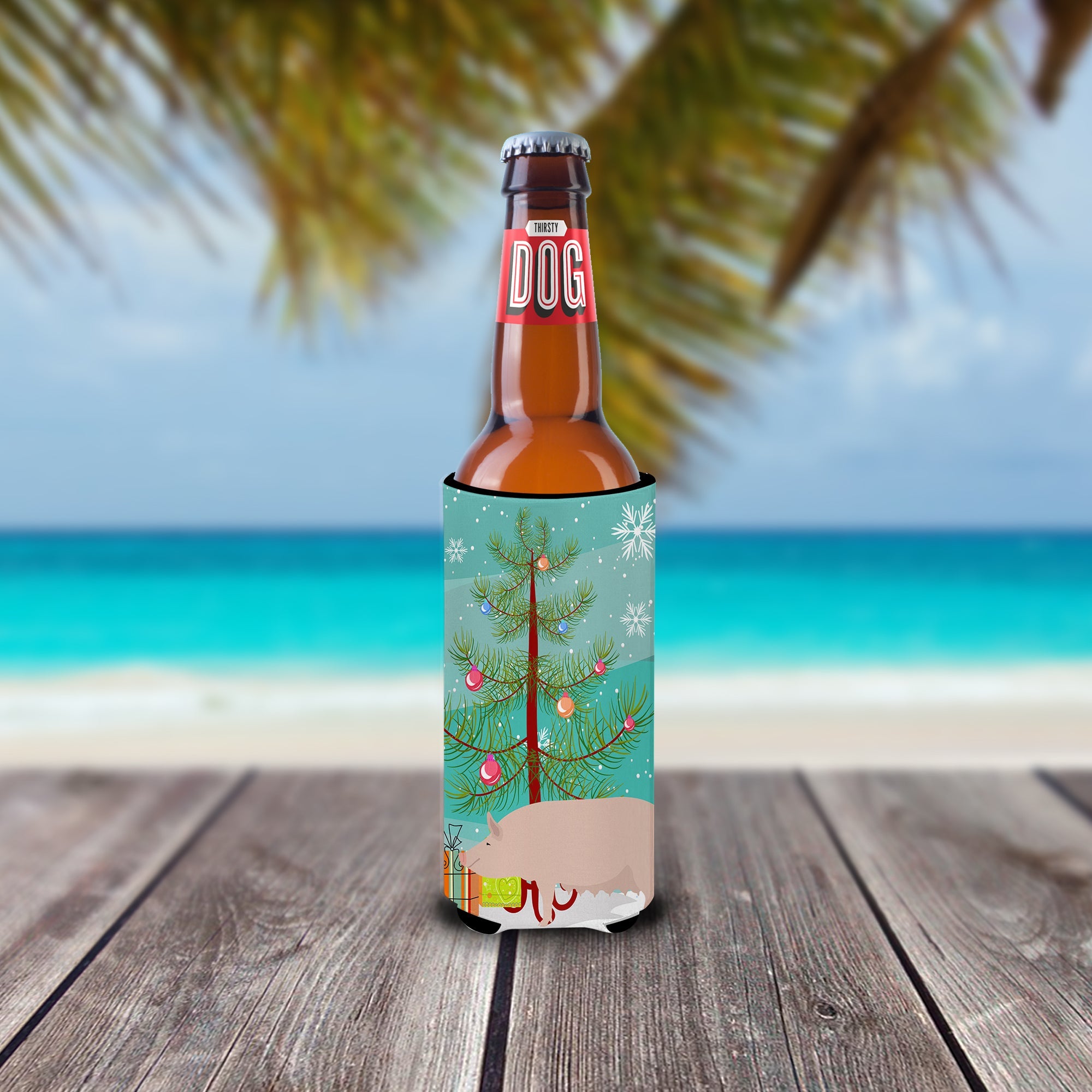 Decorate your space with our Christmas English Large White Pig artwork on a Slim Can Hugger. Elevate your beverage experience with our Slim Can Huggers, uniquely designed to fit a variety of your favorite 12 oz slim cans. Perfectly suited for Michelob Ultra, Starbucks Refreshers, Heineken Light, Bud Lite Lime, Dry Soda, Coors, Resin, Vitaminwater Energy, and Perrier Cans, our huggers ensure your drink stays refreshingly cool. The feature that sets our can huggers apart is the striking full-color artwork, exclusively created by one of our talented artists. It adds a touch of individuality and style to your drink, making it easier to identify in a crowd. A unique blend of practicality and flair, these huggers are an absolute must-have at any gathering. Our can huggers are not just beautiful but also incredibly durable. The design won't fade or peel off, and they can be safely cleaned in a washing machine. These collapsible beverage insulators are easy to store and transport, making them perfect for all occasions. Enjoy your drinks in style and comfort with our exceptional Slim Can Huggers.
