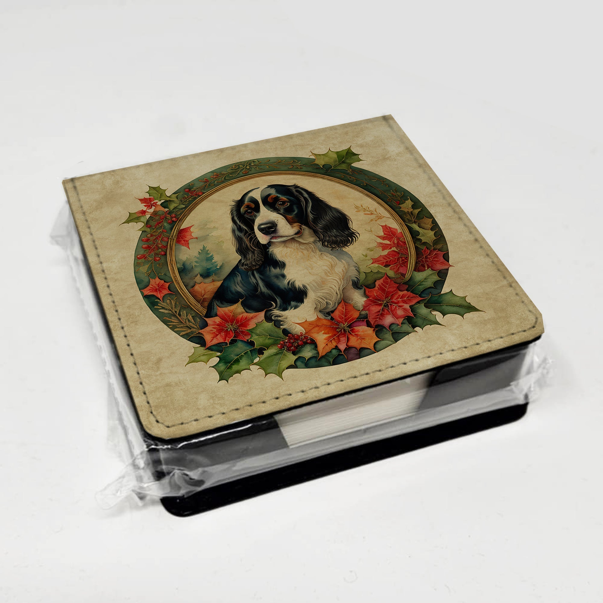 PU Leather Note Paper Holder featuring breed specific English Springer Spaniel artwork. Celebrate Christmas with this Christmas Note Paper Holder. Elevate your workspace with this PU Leather Note Paper Holder, crafted to resemble luxurious leather without the use of animal products. Made from durable synthetic PU leather, it offers both a premium look and eco-friendly appeal. This note holder, compactly sized at 4.25 x 4.25 x 1.25 inches, includes about 160 sheets of 3.75 x 3.75-inch note paper—ideal for quick notes and reminders. An exclusive artist-designed cover makes each holder uniquely vibrant, adding a splash of color and personality to any desk or office. The discrete design keeps note paper hidden, maintaining a neat and organized workspace. Perfect as a gift or for personal use, this stylish holder is refillable with standard paper, ensuring long-lasting utility. A must-have for anyone seeking a sophisticated, artful touch to their workspace while supporting animal-friendly products. Add style, organization, and creativity to your everyday routine with this elegant note paper holder.