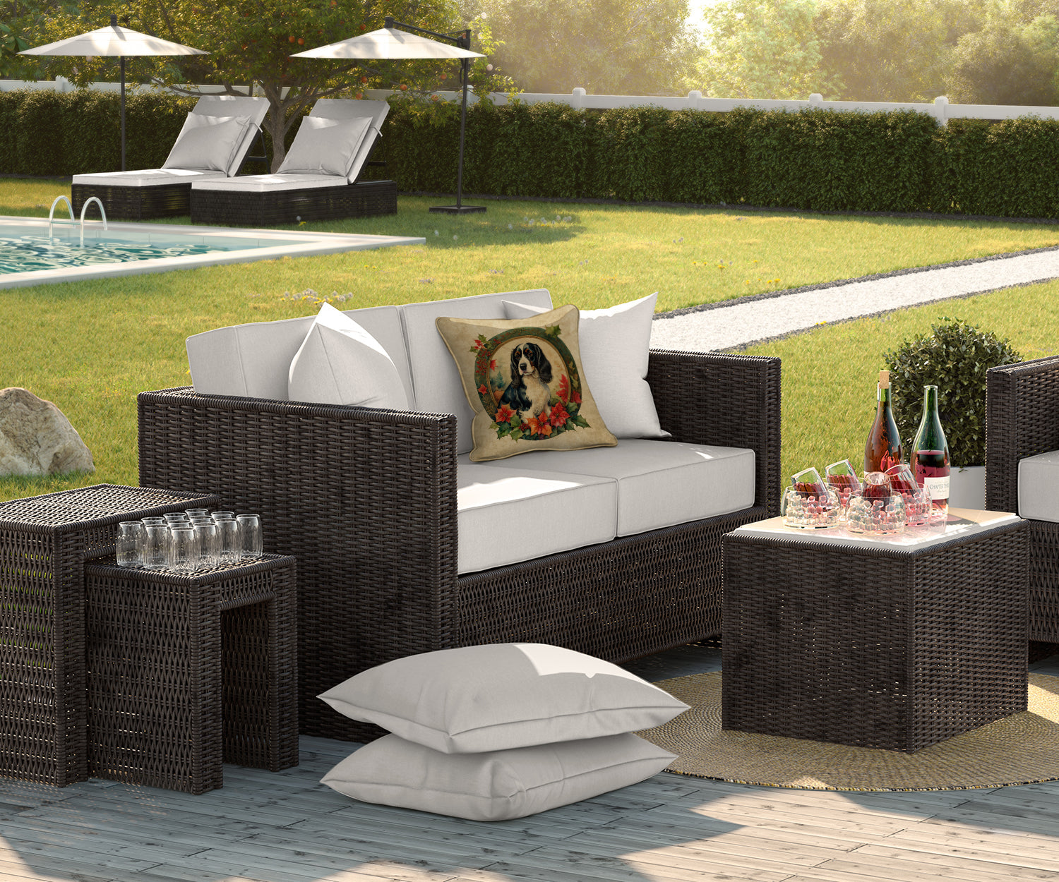 Decorate your space with our Christmas English Springer Spaniel artwork on a Pillow. Bring a bit of Winter into your home with a Winter Pillow. Revitalize your outdoor or indoor living space with Caroline's Treasures 18x18 Fabric Decorative Pillow. With a generously sized dimension of approximately 18 inches by 18 inches, this pillow makes a comfortable and aesthetic addition to any seating area. Made from a unique, water-resistant material developed by Caroline's Treasures, the pillow sham is 100% polyester fabric that's durable and ready to weather any condition. Its vibrant, full-color artwork will not fade over time as it is dyed with color-fast dyes. Whether you place it on your patio furniture, porch, veranda, or indoor couch, its soft canvas fabric ensures a cozy experience. The pillow is handcrafted in the United States, featuring a sham created from three pieces of fabric and a polyester insert for enduring shape and overstuffed comfort. Despite being robustly built to endure the outdoors, it is as soft and snug as your favorite indoor cushions. Please note, as all our pillows are handmade, sizes may vary slightly, adding to the charm of this unique decorative item.