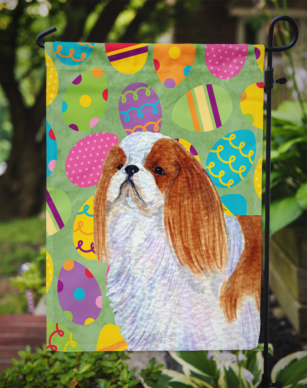 Decorate your space with our Easter English Toy Spaniel artwork on a Garden Flag. Enhance the beauty of your garden, patio, or yard with Caroline's Treasures Decorative Garden Flag, proudly made in the USA. Crafted from two pieces of thick, double-sided polyester fabric, this 2-ply garden flag is designed to withstand various weather conditions, making it water-resistant and weatherproof. Featuring correctly readable words on both sides, this garden flag offers a delightful visual experience from any angle. With its heavier weight, it stands out among other garden flags, ensuring stability and durability even in wind, rain, and snow. Measuring approximately 11 1/4 inches by 15 1/2 inches, this flag allows you to personalize your outdoor decor. It comes with a 1 1/2-inch sleeve sewn in, allowing easy attachment to any standard garden flag stand or garden size porch hanger (sold separately). Make a statement in your outdoor space with Caroline's Treasures Decorative Garden Flag, a vibrant and high-quality flag that adds color and personality to your surroundings. Proudly made in the USA, it's a symbol of quality craftsmanship and attention to detail.