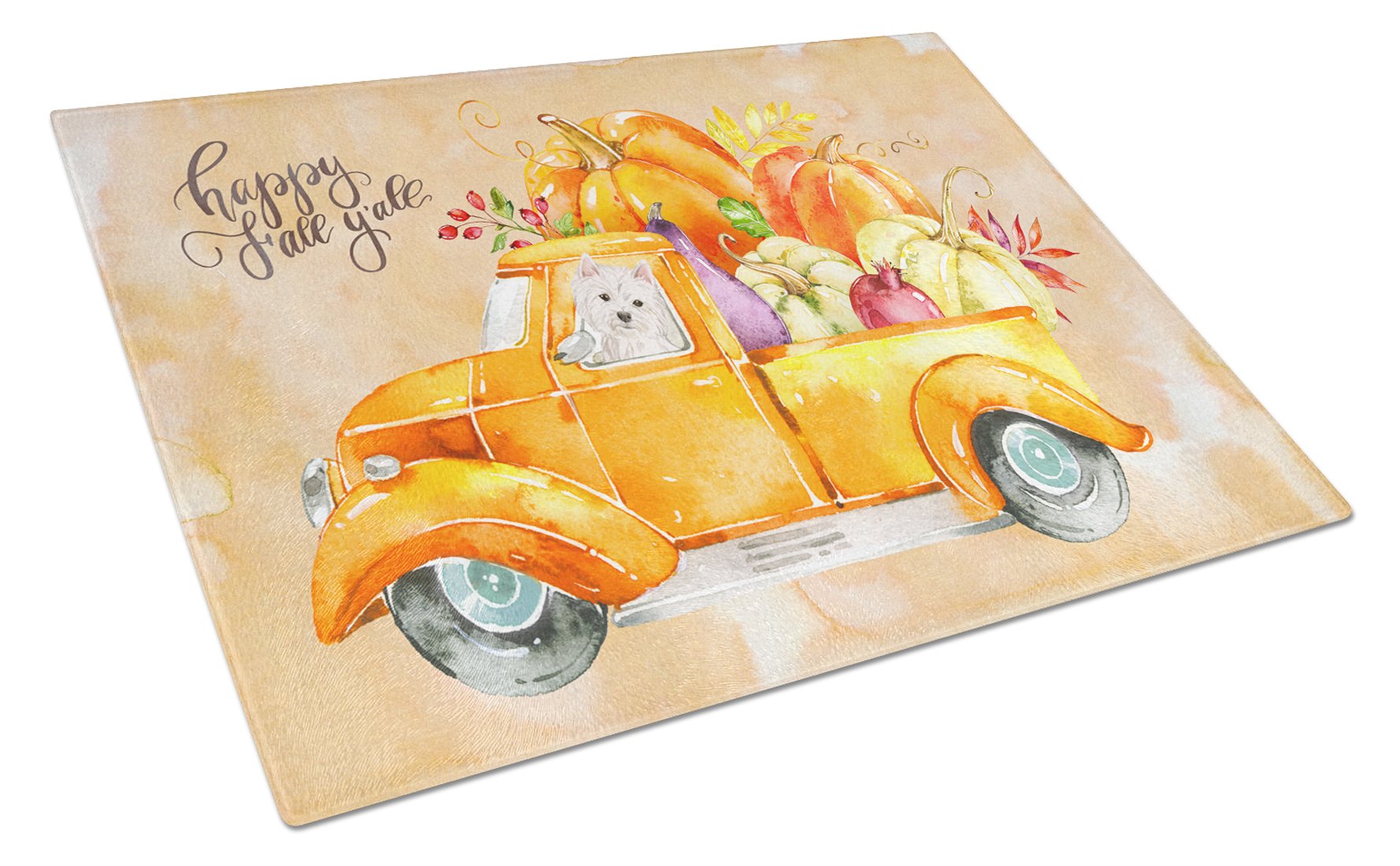 Decorate your space with our Thanksgiving West Highland White Terrier artwork on a Cutting Board. Bring a bit of Fall into your home with a Fall Cutting Board. Introduce your kitchen to the vibrant, large Decorative Glass Cutting Board from Caroline's Treasures. Crafted from resilient tempered glass, this board is not only a utilitarian necessity but also a colorful art piece. With its generous dimensions of 15 inches in height and 12 inches in length, it offers ample space for all your cutting needs. Every piece showcases captivating artwork from distinguished artists, bringing an aesthetic edge to your kitchen. Beyond its attractive design, this cutting board ensures your countertop stays pristine and unscathed, owing to its heat-resistant properties. Engineered with user convenience in mind, it features non-skid feet for stability, and rounded corners for additional safety. Its robust construction renders it virtually unbreakable, guaranteeing longevity. The board comes with protective feet bumpers, maintaining its position during use. This product is recommended to be hand washed only. Proudly printed and assembled in the United States, this cutting board exemplifies superior craftsmanship. With Caroline's Treasures' Decorative Glass Cutting Board, you're investing in a blend of functionality and artistic flair.