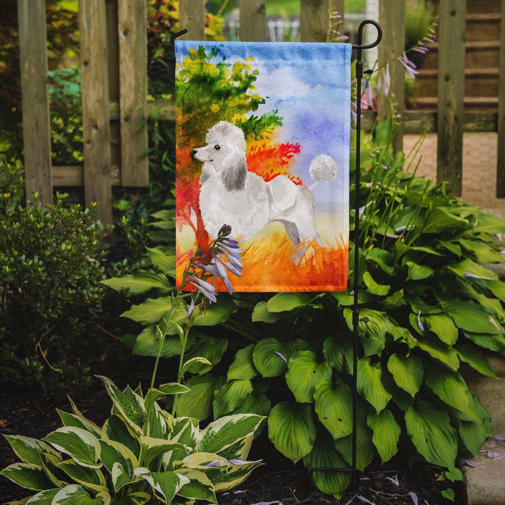 Decorate your space with our Poodle artwork on a Garden Flag. Bring a bit of Fall into your home with a Fall Garden Flag. Enhance the beauty of your garden, patio, or yard with Caroline's Treasures Decorative Garden Flag, proudly made in the USA. Crafted from two pieces of thick, double-sided polyester fabric, this 2-ply garden flag is designed to withstand various weather conditions, making it water-resistant and weatherproof. Featuring correctly readable words on both sides, this garden flag offers a delightful visual experience from any angle. With its heavier weight, it stands out among other garden flags, ensuring stability and durability even in wind, rain, and snow. Measuring approximately 11 1/4 inches by 15 1/2 inches, this flag allows you to personalize your outdoor decor. It comes with a 1 1/2-inch sleeve sewn in, allowing easy attachment to any standard garden flag stand or garden size porch hanger (sold separately). Make a statement in your outdoor space with Caroline's Treasures Decorative Garden Flag, a vibrant and high-quality flag that adds color and personality to your surroundings. Proudly made in the USA, it's a symbol of quality craftsmanship and attention to detail.