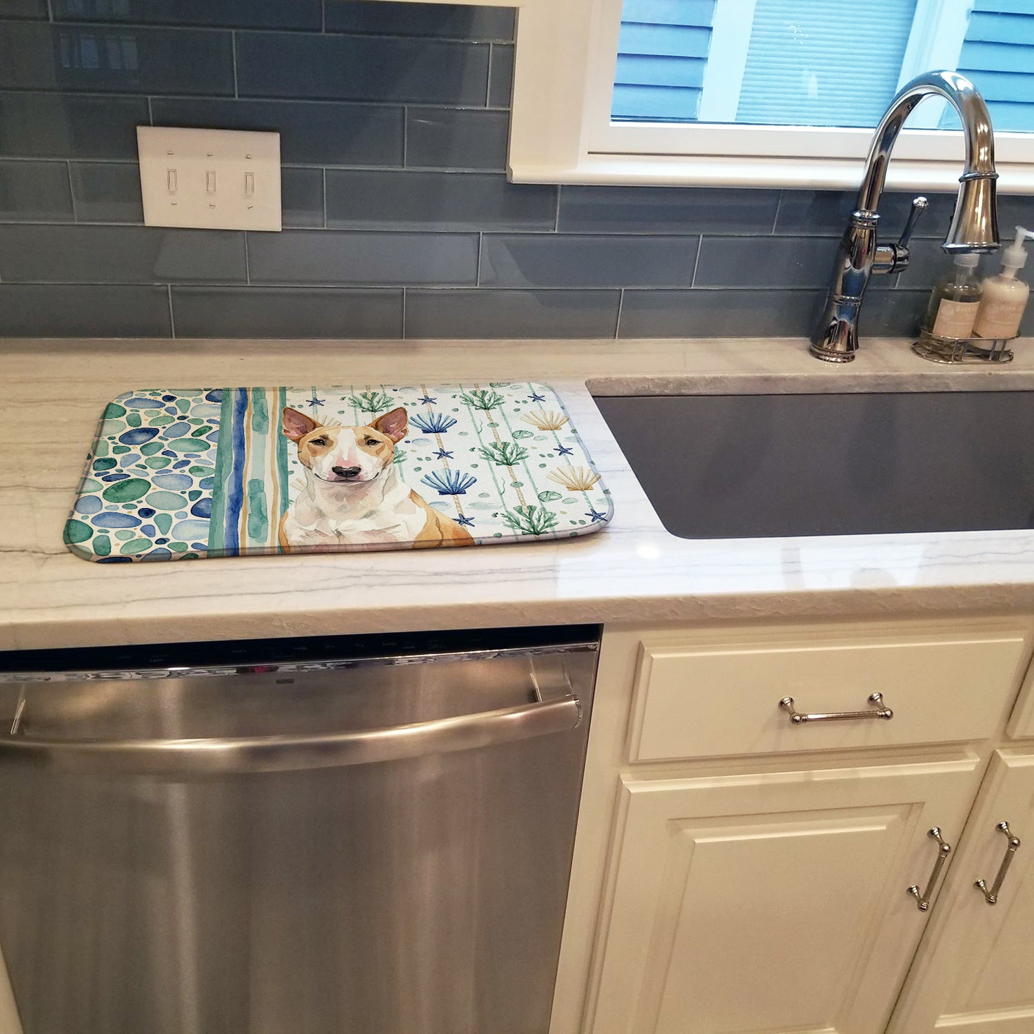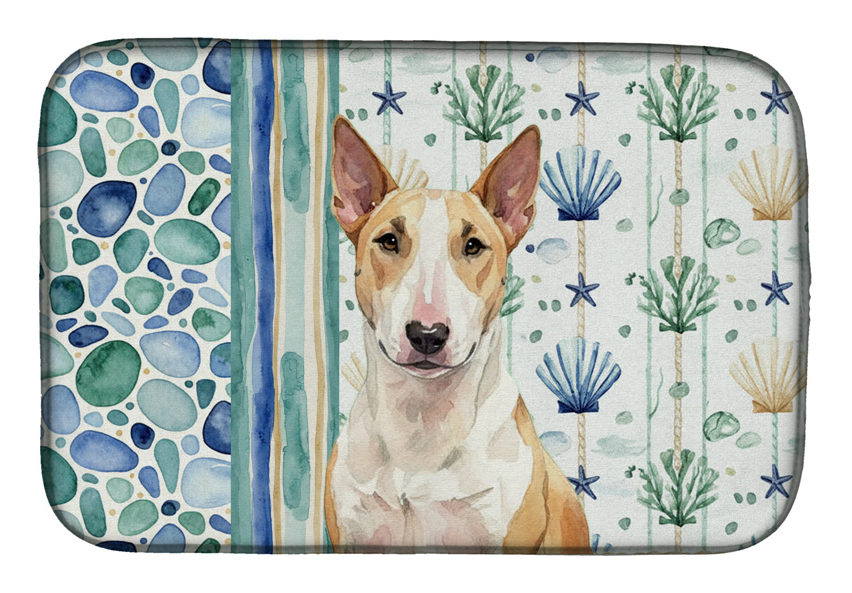 Shown here is the Fawn and White Bull Terrier Coastal Sea Glass Dish Drying Mat from Caroline's Treasures featuring artwork of a Bull Terrier in a Everyday design. The detailed illustration and vibrant colors make it a standout accent that celebrates both seasonal style and love for the subject. This image features a calming coastal watercolor pattern with soft seashells, seaweed, starfish, and pebble-inspired accents arranged in a repeating design. The soothing palette of blues, greens, and sandy neutrals creates a relaxed, beach-inspired look that adds a fresh and tranquil feel to any space. Everyday décor celebrates personal style and the small moments that make a house feel like home. Thoughtful designs add warmth and personality that can be enjoyed year-round. Say goodbye to messy countertops and soggy dish towels with our innovative dish drying mat. Our high-quality dish drying pad is designed to keep your countertops dry while offering a stylish and efficient solution. Whether you're air drying dishes, glasses, stemware, silverware, pots, pans, bottles, or even fruits and vegetables, our dish mat is the perfect choice. The 14 inches x 21 inches size fits most counters and dish drying racks, and the non-slip design ensures stability. Made with water-absorbent polyester and a polyurethane foam insert, our dish drying mat is not only functional but also durable. It's machine washable and printed in the USA for long-lasting use. The beautiful artwork adds flair to your kitchen decor, making it a perfect housewarming gift or present for any occasion. Upgrade your kitchen experience with our absorbent and versatile dish drying mat. Perfect for: Kitchen counters and sinks, everyday dish drying and countertop protection, Dogs-themed homes, or year-round use for Bull Terrier lovers. Bull Terriers are muscular dogs known for their playful personality and distinctive appearance. This confident breed is admired for its loyalty and strong bond with family. Makes a heartfelt gift for: Bull Terrier owners, Dogs lovers, Everyday gifts, pet parents, friends who adore their Bull Terrier, or anyone celebrating Dogs.