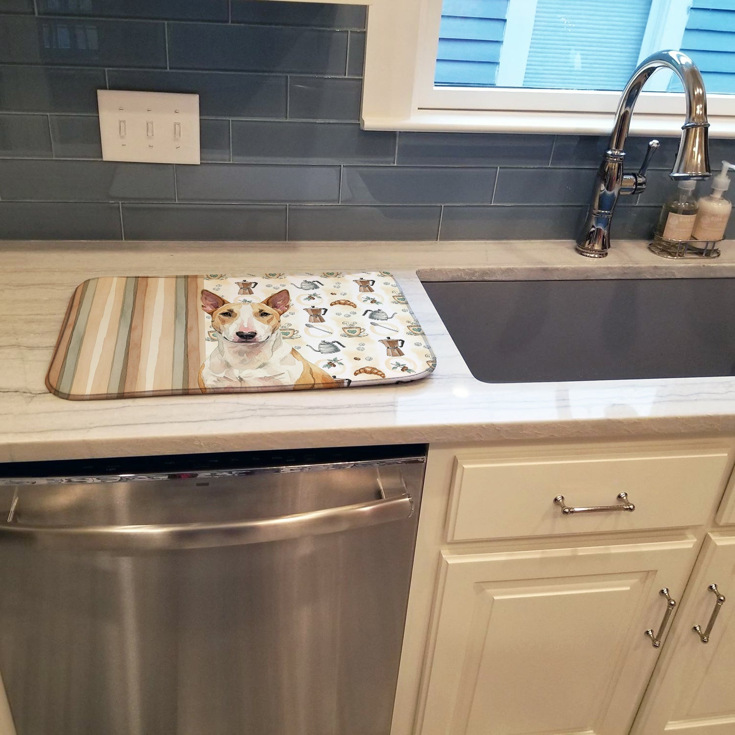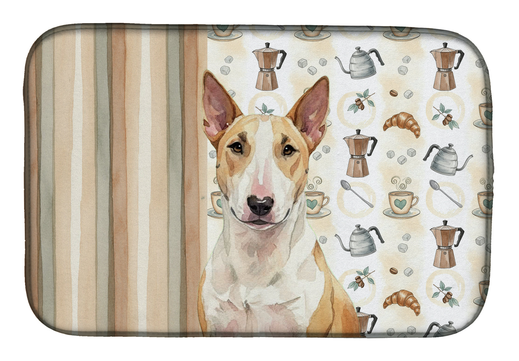 Shown here is the Fawn and White Bull Terrier Coffee Bar Dish Drying Mat from Caroline's Treasures featuring artwork of a Bull Terrier in a Everyday design. The detailed illustration and vibrant colors make it a standout accent that celebrates both seasonal style and love for the subject. This image features a cozy watercolor coffee-themed pattern with illustrated mugs, moka pots, kettles, croissants, coffee beans, and sugar cubes arranged in a repeating design. Soft neutral tones with warm browns, creams, and subtle sage accents create an inviting, café-inspired look that feels comforting and relaxed. Everyday décor celebrates personal style and the small moments that make a house feel like home. Thoughtful designs add warmth and personality that can be enjoyed year-round. Say goodbye to messy countertops and soggy dish towels with our innovative dish drying mat. Our high-quality dish drying pad is designed to keep your countertops dry while offering a stylish and efficient solution. Whether you're air drying dishes, glasses, stemware, silverware, pots, pans, bottles, or even fruits and vegetables, our dish mat is the perfect choice. The 14 inches x 21 inches size fits most counters and dish drying racks, and the non-slip design ensures stability. Made with water-absorbent polyester and a polyurethane foam insert, our dish drying mat is not only functional but also durable. It's machine washable and printed in the USA for long-lasting use. The beautiful artwork adds flair to your kitchen decor, making it a perfect housewarming gift or present for any occasion. Upgrade your kitchen experience with our absorbent and versatile dish drying mat. Perfect for: Kitchen counters and sinks, everyday dish drying and countertop protection, Dogs-themed homes, or year-round use for Bull Terrier lovers. Bull Terriers are muscular dogs known for their playful personality and distinctive appearance. This confident breed is admired for its loyalty and strong bond with family. Makes a heartfelt gift for: Bull Terrier owners, Dogs lovers, Everyday gifts, pet parents, friends who adore their Bull Terrier, or anyone celebrating Dogs.