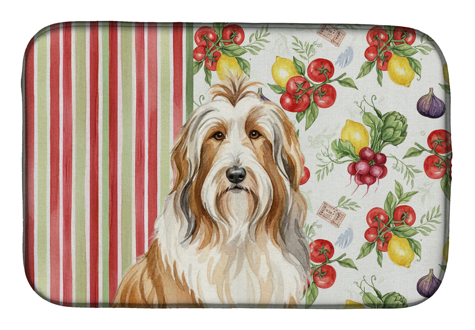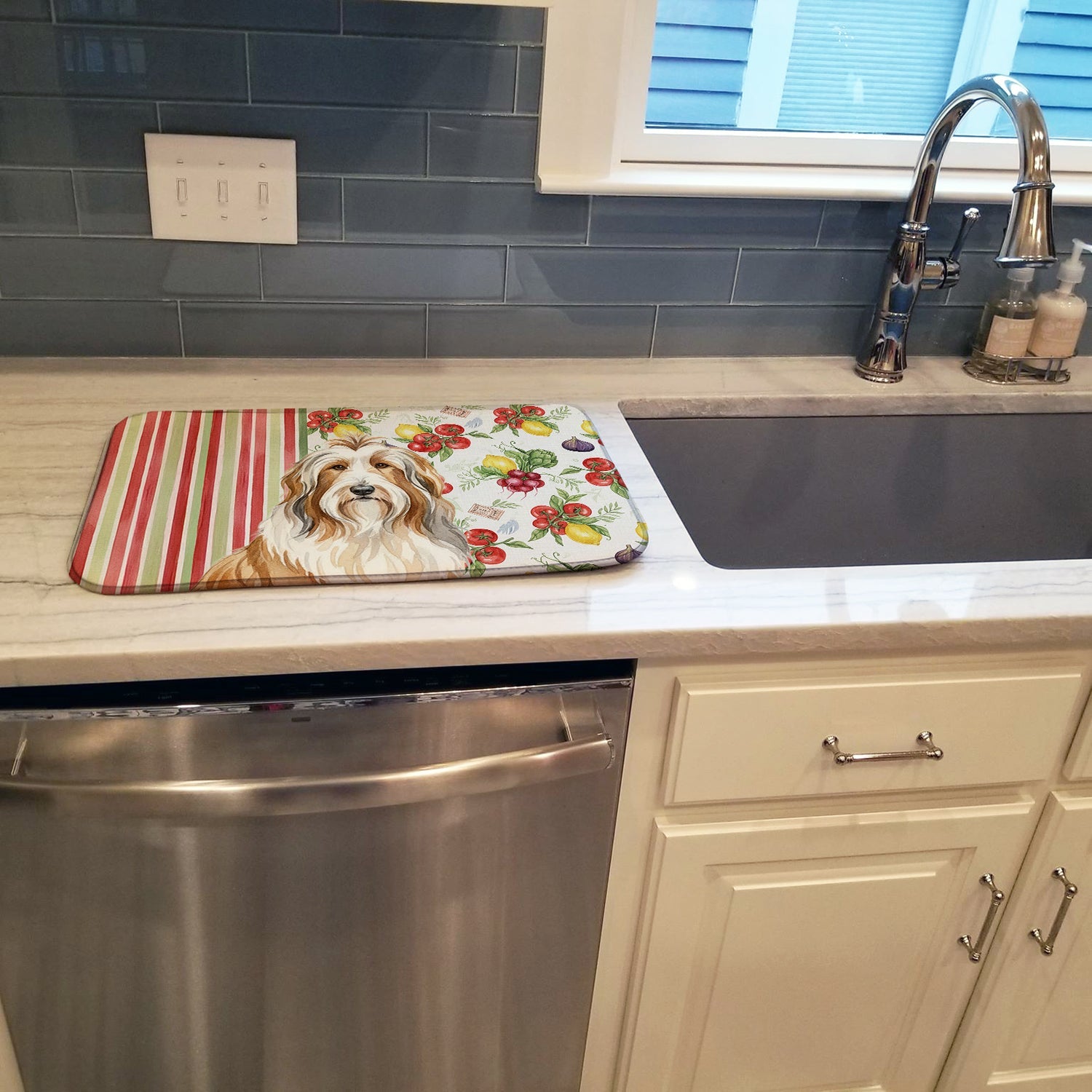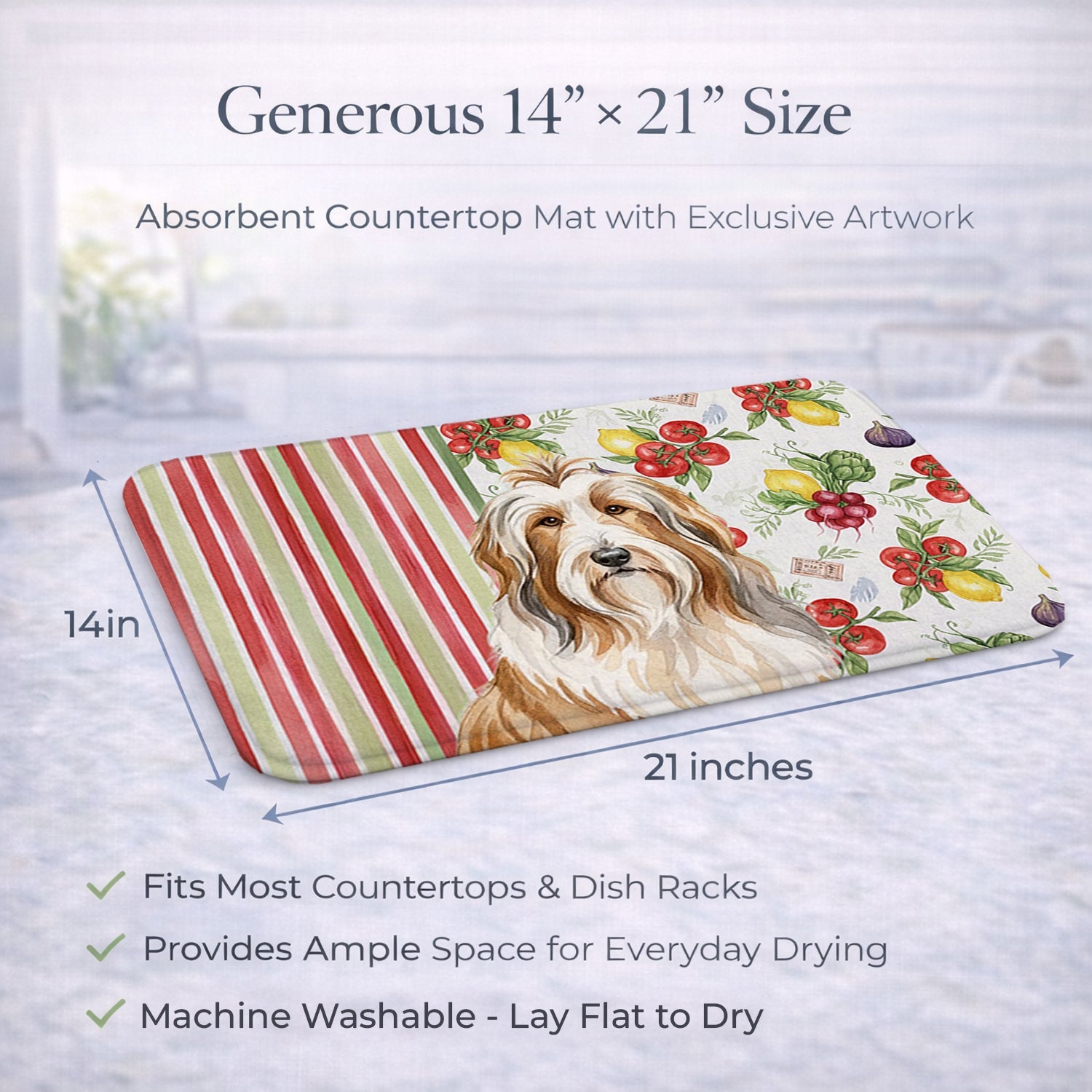 Shown here is the Fawn Bearded Collie Vegetables Dish Drying Mat from Caroline's Treasures featuring artwork of a Bearded Collie in a Everyday design. The detailed illustration and vibrant colors make it a standout accent that celebrates both seasonal style and love for the subject. This image features a vibrant watercolor vegetable pattern with tomatoes, lemons, artichokes, figs, radishes, and leafy greens arranged in a repeating design, paired with classic red and green stripes. The bright, garden-fresh palette creates a cheerful, farmhouse-inspired look that feels lively, welcoming, and perfect for kitchen décor. Everyday décor celebrates personal style and the small moments that make a house feel like home. Thoughtful designs add warmth and personality that can be enjoyed year-round. Say goodbye to messy countertops and soggy dish towels with our innovative dish drying mat. Our high-quality dish drying pad is designed to keep your countertops dry while offering a stylish and efficient solution. Whether you're air drying dishes, glasses, stemware, silverware, pots, pans, bottles, or even fruits and vegetables, our dish mat is the perfect choice. The 14 inches x 21 inches size fits most counters and dish drying racks, and the non-slip design ensures stability. Made with water-absorbent polyester and a polyurethane foam insert, our dish drying mat is not only functional but also durable. It's machine washable and printed in the USA for long-lasting use. The beautiful artwork adds flair to your kitchen decor, making it a perfect housewarming gift or present for any occasion. Upgrade your kitchen experience with our absorbent and versatile dish drying mat. Perfect for: Kitchen counters and sinks, everyday dish drying and countertop protection, Dogs-themed homes, or year-round use for Bearded Collie lovers. Bearded Collies are energetic herding dogs known for their intelligence and joyful personality. Often called Beardies, this breed is admired for its enthusiasm, loyalty, and strong connection with its family. Makes a heartfelt gift for: Bearded Collie owners, Dogs lovers, Everyday gifts, pet parents, friends who adore their Bearded Collie, or anyone celebrating Dogs.