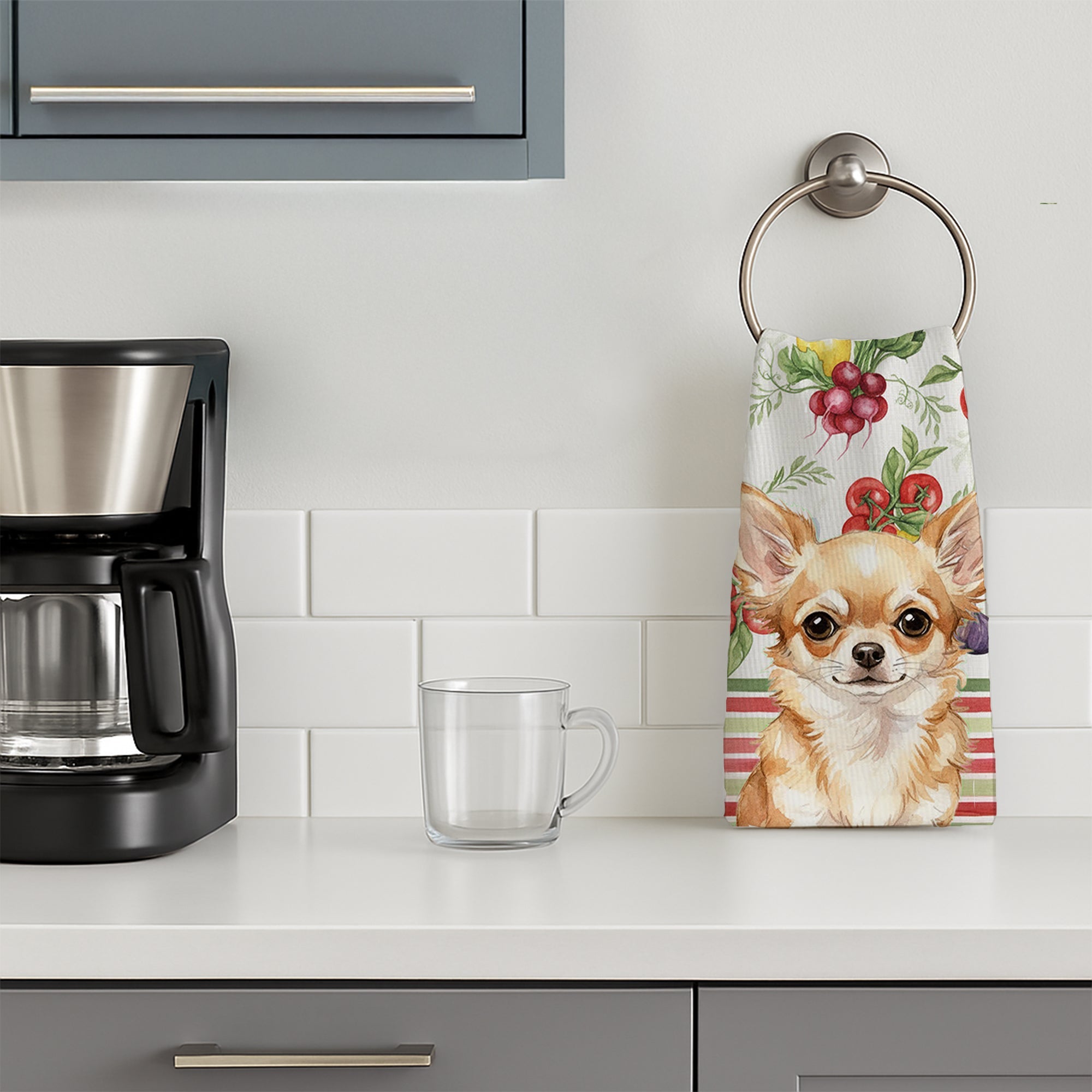 Kitchen Towel featuring breed specific Chihuahua artwork. Bring cozy everyday charm to your sink or powder room with a plush velour towel featuring original watercolor artwork. The front is a soft, color-rich minky polyester that polishes glassware to a brilliant shine; the back is 100% white cotton terry loop for quick absorbency on hands, dishes, and counters. Artwork is dyed into the fibers for lasting color that won’t crack or peel. Finished edges keep the shape wash after wash. Size: 15" x 25". Machine wash; tumble dry low. Designed and printed in the USA.