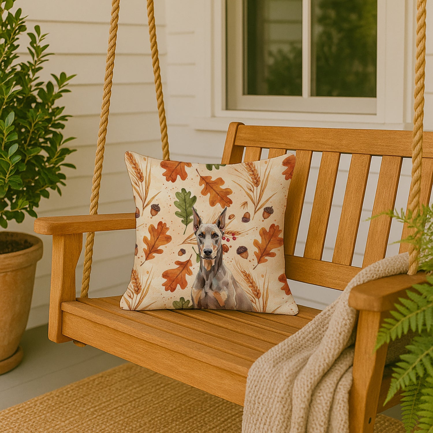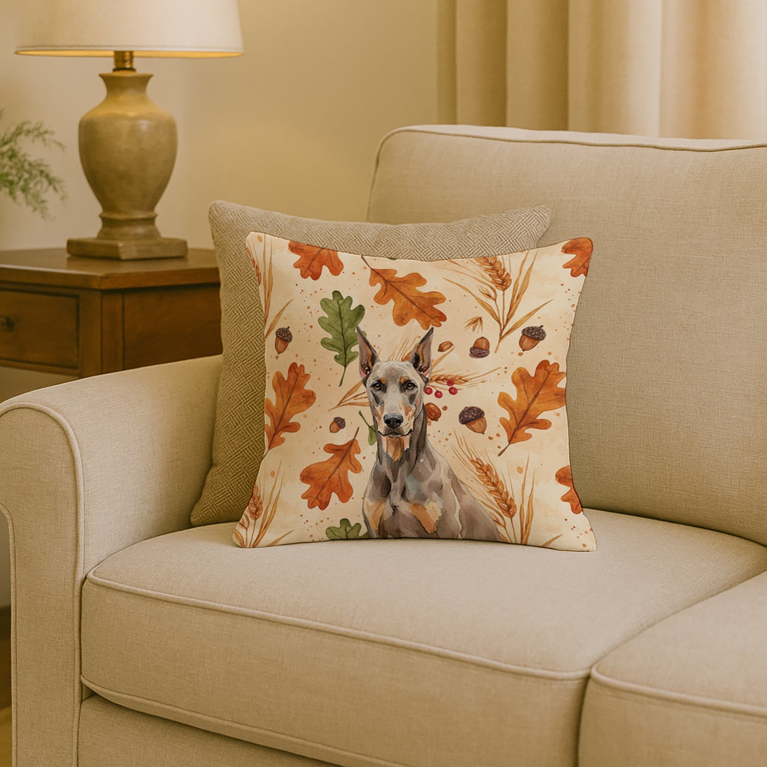 Throw Pillow featuring breed specific Doberman Pinscher artwork. Celebrate Thanksgiving with this Thanksgiving Pillow. Revitalize your outdoor or indoor living space with Caroline's Treasures 18x18 Fabric Decorative Pillow. With a generously sized dimension of approximately 18 inches by 18 inches, this pillow makes a comfortable and aesthetic addition to any seating area. Made from a unique, water-resistant material developed by Caroline's Treasures, the pillow sham is 100% polyester fabric that's durable and ready to weather any condition. Its vibrant, full-color artwork will not fade over time as it is dyed with color-fast dyes. Whether you place it on your patio furniture, porch, veranda, or indoor couch, its soft canvas fabric ensures a cozy experience. The pillow is handcrafted in the United States, featuring a sham created from three pieces of fabric and a polyester insert for enduring shape and overstuffed comfort. Despite being robustly built to endure the outdoors, it is as soft and snug as your favorite indoor cushions. Please note, as all our pillows are handmade, sizes may vary slightly, adding to the charm of this unique decorative item.