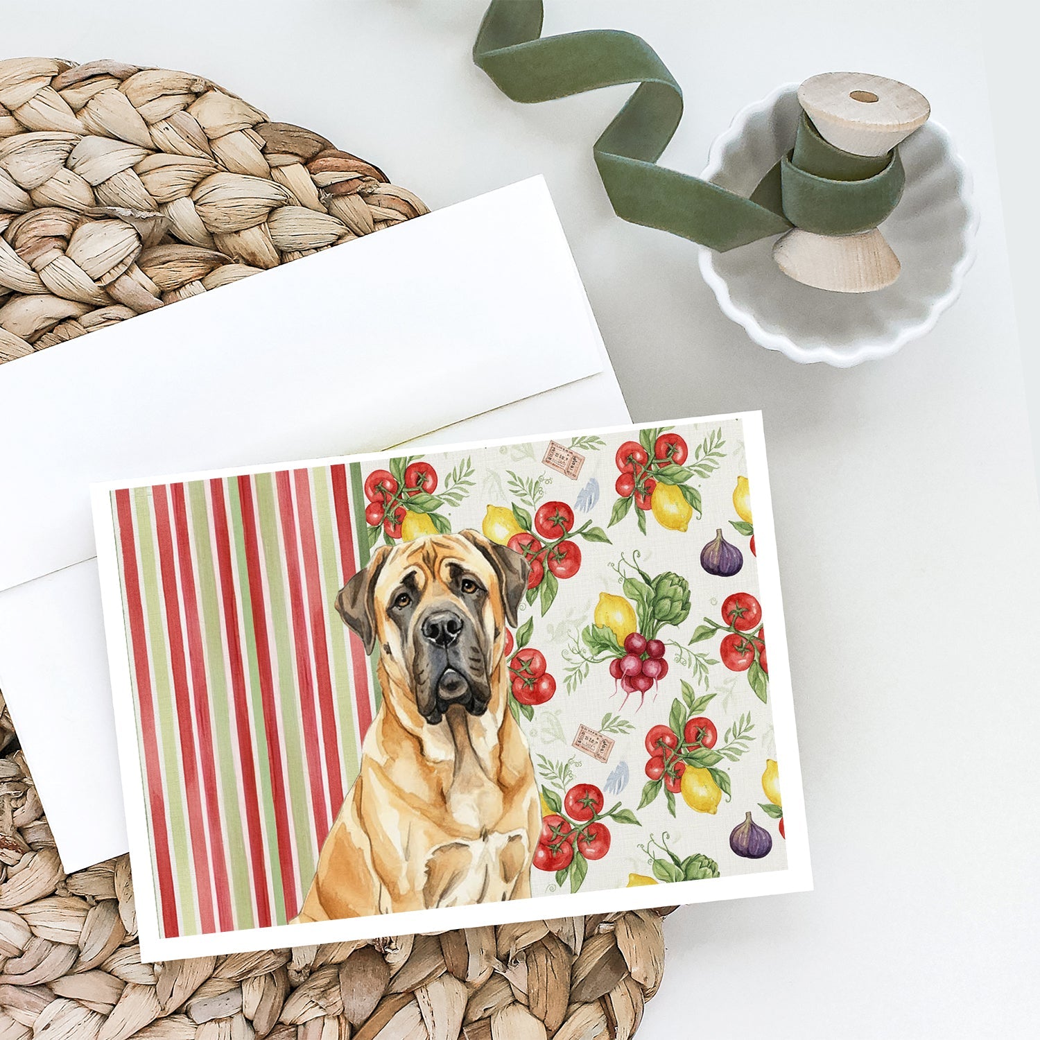 Shown here is the Fawn English Mastiff Vegetables Greeting Cards Pack of 8 from Caroline's Treasures featuring artwork of a English Mastiff in a Everyday design. The detailed illustration and vibrant colors make it a standout accent that celebrates both seasonal style and love for the subject. This image features a vibrant watercolor vegetable pattern with tomatoes, lemons, artichokes, figs, radishes, and leafy greens arranged in a repeating design, paired with classic red and green stripes. The bright, garden-fresh palette creates a cheerful, farmhouse-inspired look that feels lively, welcoming, and perfect for kitchen décor. Everyday décor celebrates personal style and the small moments that make a house feel like home. Thoughtful designs add warmth and personality that can be enjoyed year-round. Celebrate special moments with Caroline's Treasures Printed Greeting Card Pack. This pack includes eight beautifully folded 5x7 cards, accompanied by eight matching white envelopes. With blank interiors, these cards provide ample space for your personalized messages and heartfelt holiday greetings. Each card features captivating full-color artwork, meticulously printed in our facility on high-quality 80 lb cover stock or 216 GSM. The super smooth finish of the white cards enhances the visual impact of the artwork, creating a truly stunning presentation. Designed by our talented in-house artists or licensed artists, the artwork on these cards showcases their creativity and attention to detail. From vibrant illustrations to captivating designs, each card tells its own unique story. Whether it's for birthdays, anniversaries, holidays, or any special occasion, Caroline's Treasures Greeting Card Pack is the perfect way to convey your heartfelt sentiments. Share joy, love, and warm wishes with these exquisite cards and make every moment unforgettable. Perfect for: Writing personal messages, everyday correspondence, and thoughtful notes, Dogs-themed stationery collections, or year-round use for English Mastiff lovers. English Mastiffs are massive yet gentle dogs known for their calm demeanor and loyalty. This ancient guardian breed is admired for its protective instincts and steady, affectionate presence. Makes a heartfelt gift for: English Mastiff owners, Dogs lovers, Everyday gifts, pet parents, friends who adore their English Mastiff, or anyone celebrating Dogs.