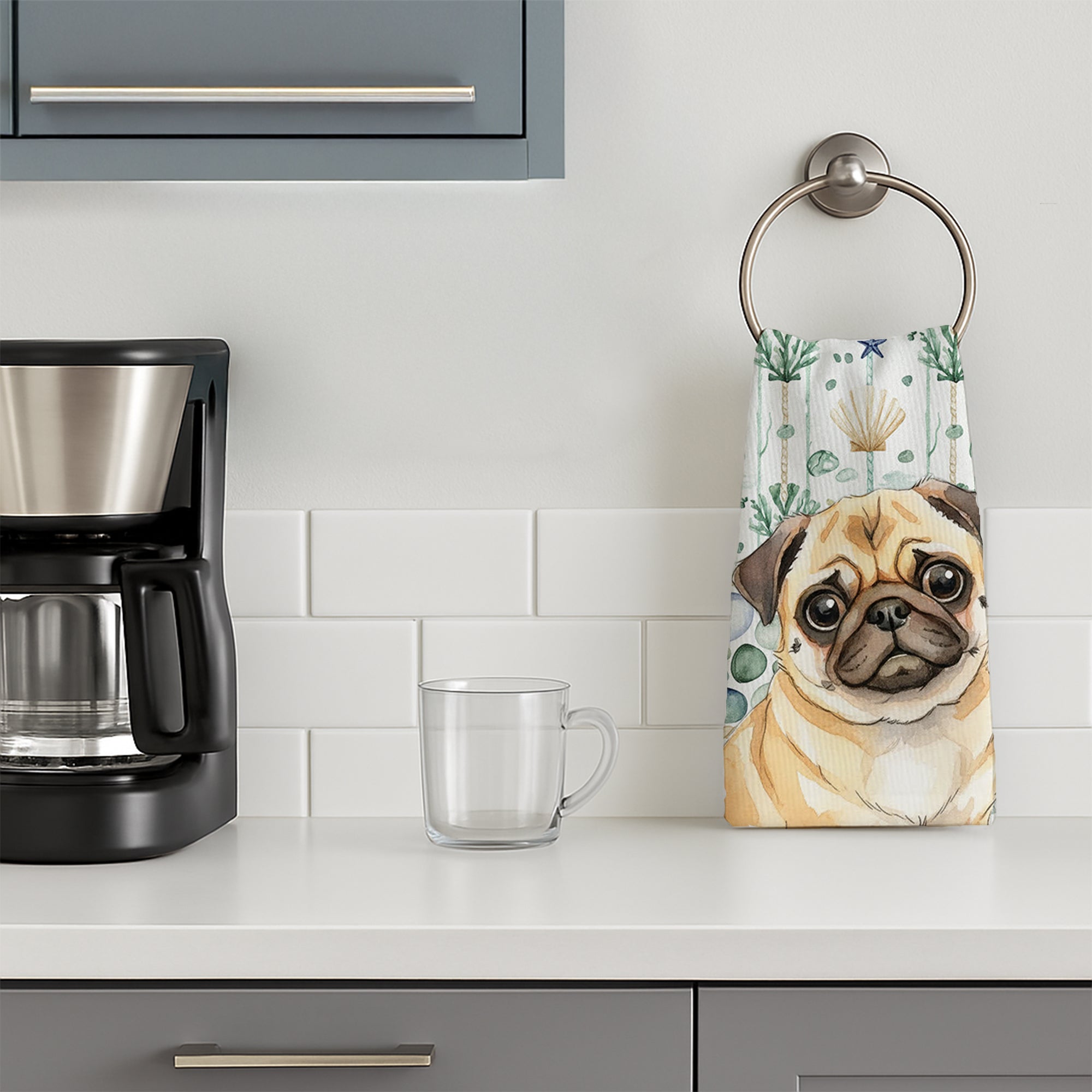 Kitchen Towel featuring breed specific Pug artwork. Bring breezy coastal charm to your kitchen or bath with our plush velour towel featuring original watercolor artwork. The soft minky polyester front showcases vivid seashell and starfish designs with a dog portrait, perfect for polishing glassware to a brilliant shine. The 100% cotton terry loop back delivers superior absorbency for drying hands, dishes, or counters. Artwork is dyed directly into the fibers for lasting color that won’t crack or peel. Each towel measures 15" x 25", with bound edges to maintain shape after repeated washes. Machine washable and tumble dry low for easy care. Designed and printed in the USA, these towels combine function and style—ideal for beach homes, coastal kitchens, or as thoughtful gifts.