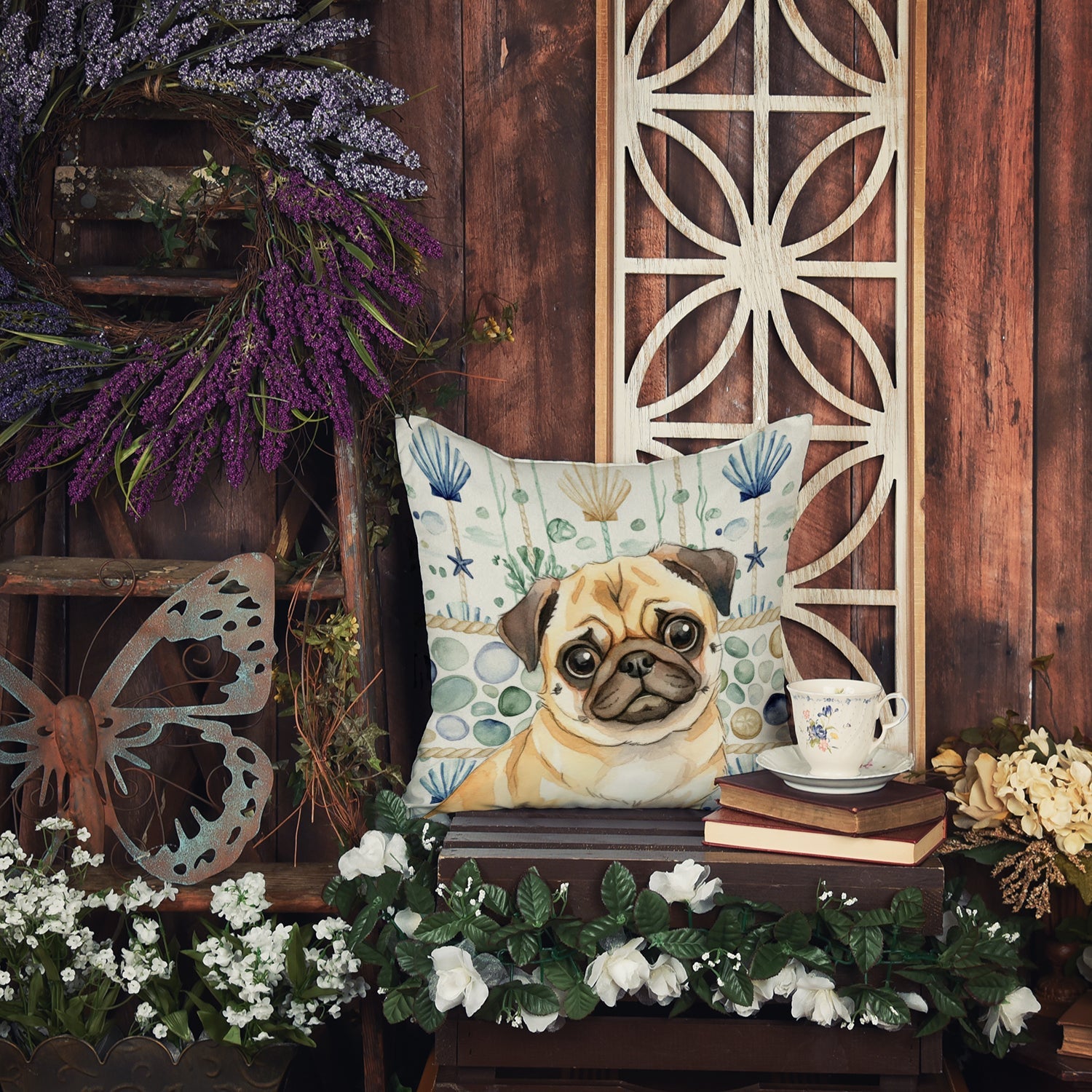 Fawn Pug Coastal Sea Glass Throw Pillow